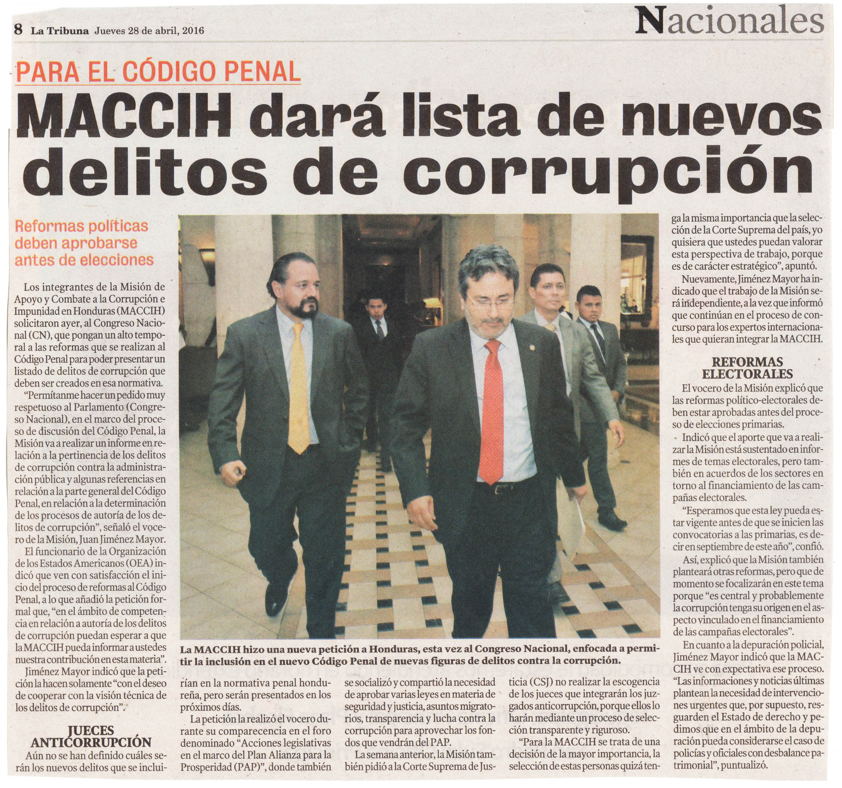 MaccihOEA Para el Código Penal: Maccih dará lista de nuevos delitos de corrupción ebueso Diario: La Tribuna Fecha: 28 de abril de 2016 Página: 8