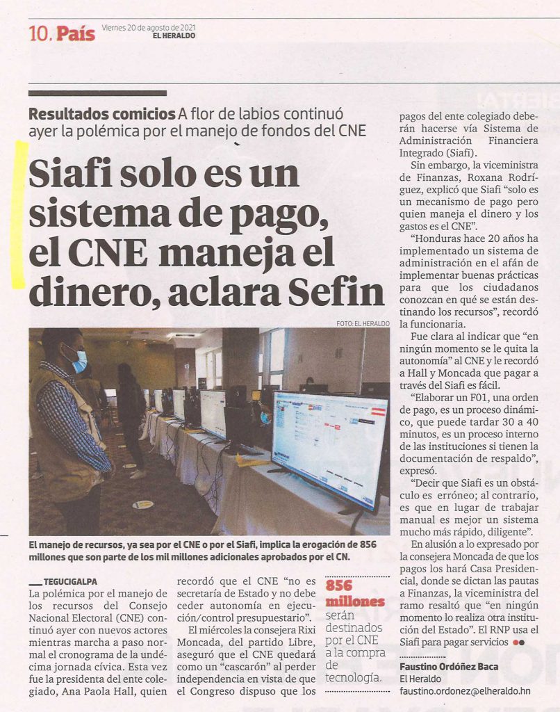 Nacionales Siafi solo en un sistema de pago, el CNE maneja el dinero, aclara Sefin Óscar Sánchez Diario: El Heraldo Fecha: 20 de agosto, 2021 Página: 10
