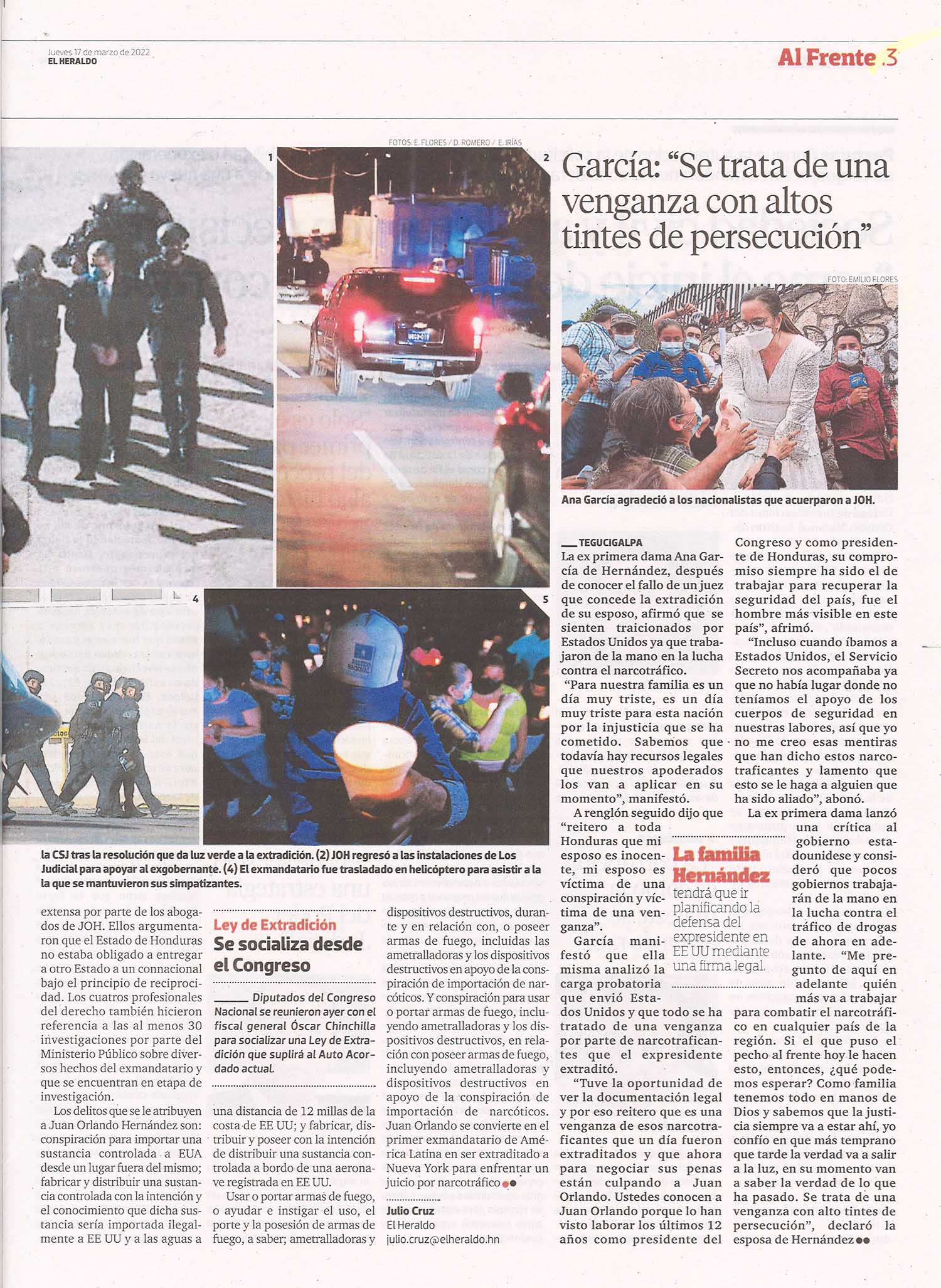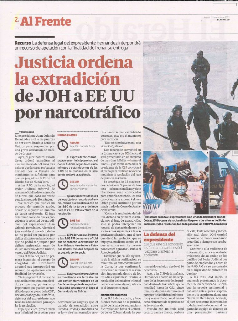 Nacionales Justicia ordena la extradición de JOH a EEUU por narcotráfico Odeth Aguilera Diario: El Heraldo Fecha: 17 marzo 2022 Páginas: 2 y 3