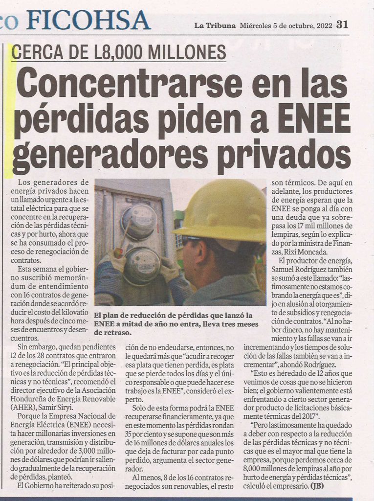 ENEENacionales Concentrarse en la pérdidas piden a ENEE generadores privados Odeth Aguilera Diario: La Tribuna Fecha: 5 octubre 2022 Página: 31