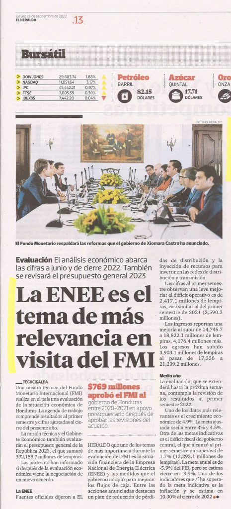 ENEENacionales La ENEE es el tema de más relevancia en visita del FMI Odeth Aguilera Diario: El Heraldo Fecha: 29 septiembre 2022 Página: 13