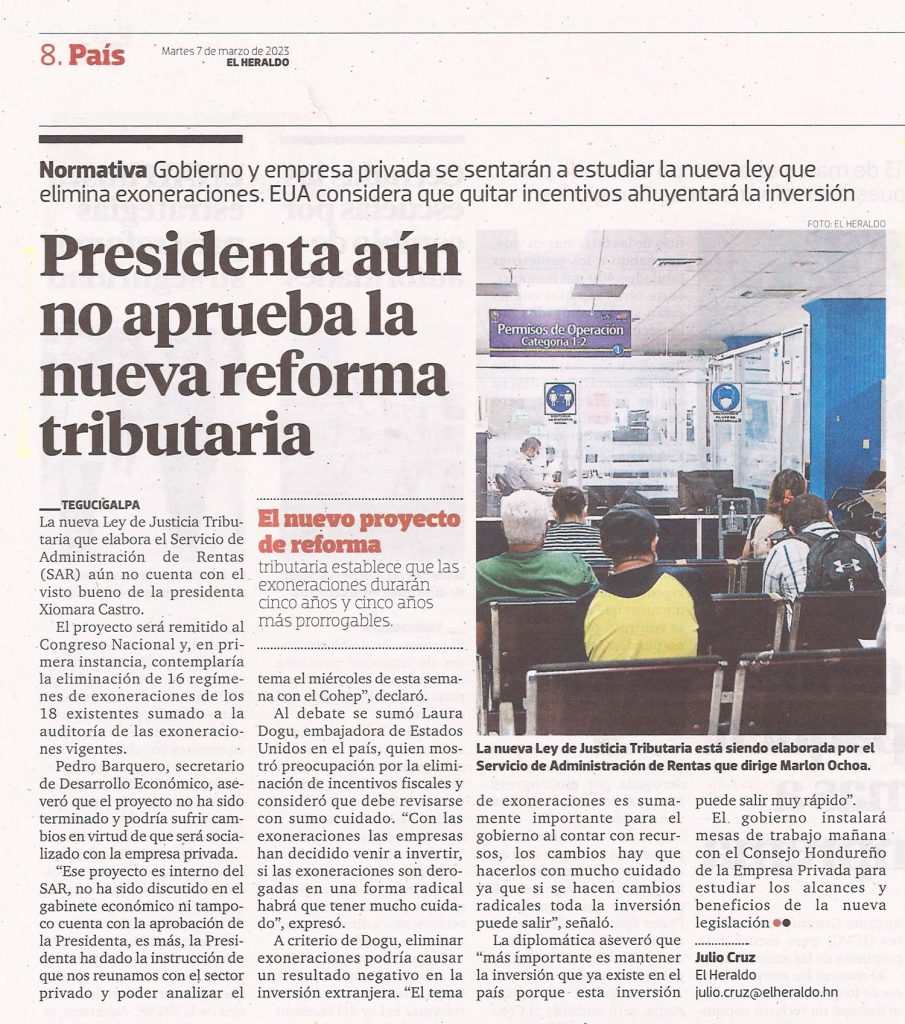 Nacionales Presidenta aún no aprueba la nueva reforma tributaria Francis Lanza Diario: El Heraldo Fecha: 7 marzo 2023 Página: 8