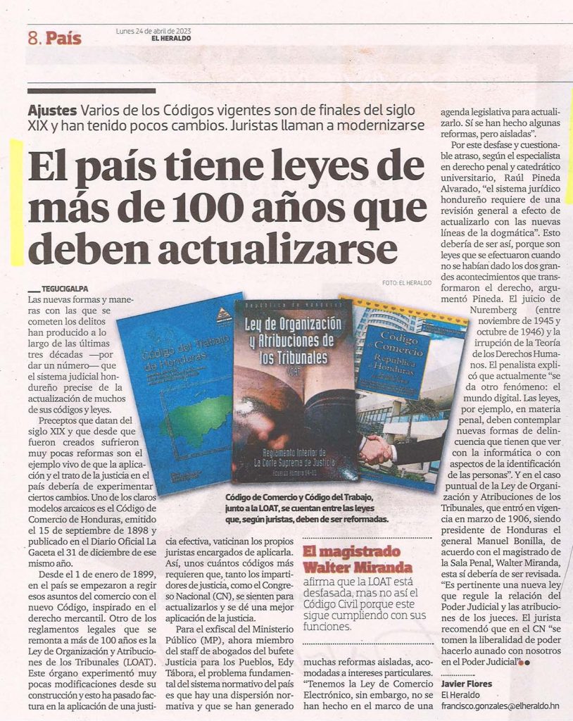 Nacionales El país tiene leyes de más de 100 años que deben actualizarse Odeth Aguilera Diario: El Heraldo Fecha: 24 abril 2023 Página: 8