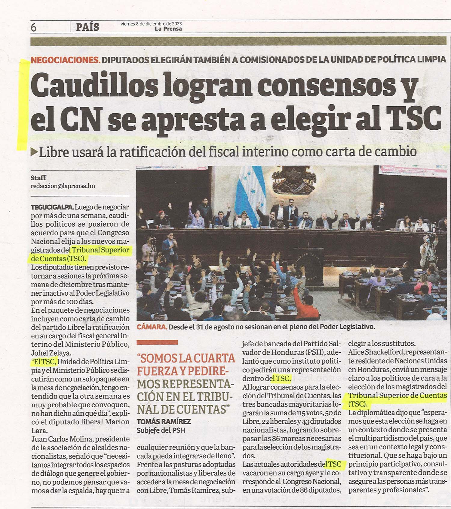 TSC Caudillos logran consensos y el CN se apresta a elegir al TSC Odeth Aguilera Diario: La Prensa Fecha: 8 Diciembre 2023 Página: 6