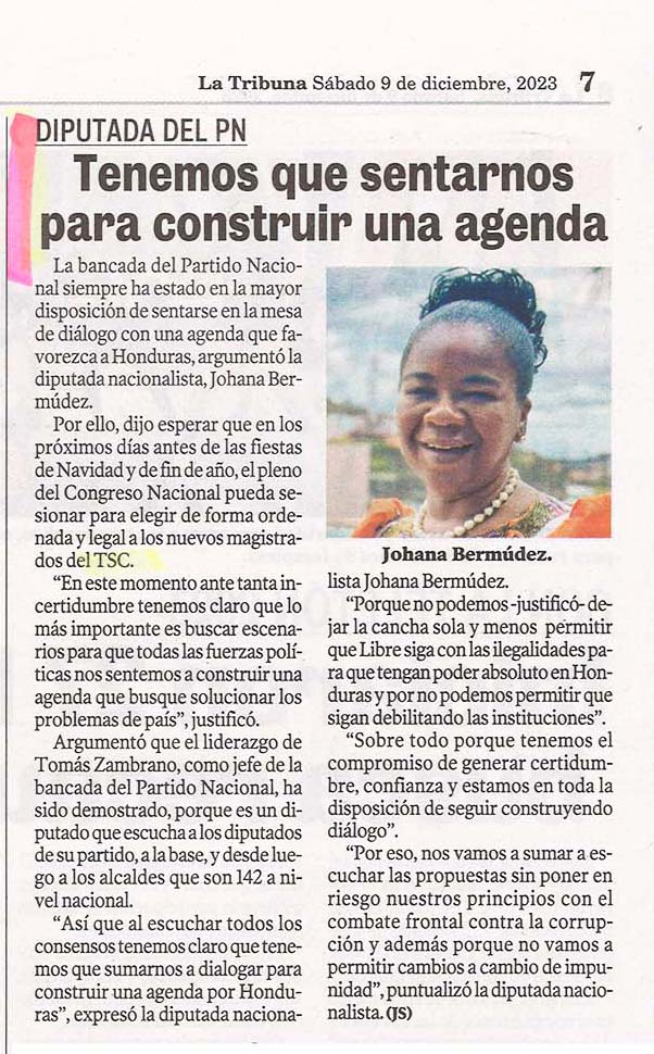 TSC DIPUTADA DEL PN: Tenemos que sentarnos para construir una agenda Odeth Aguilera Diario: La Tribuna Fecha: 9 Diciembre 2023 Página: 7
