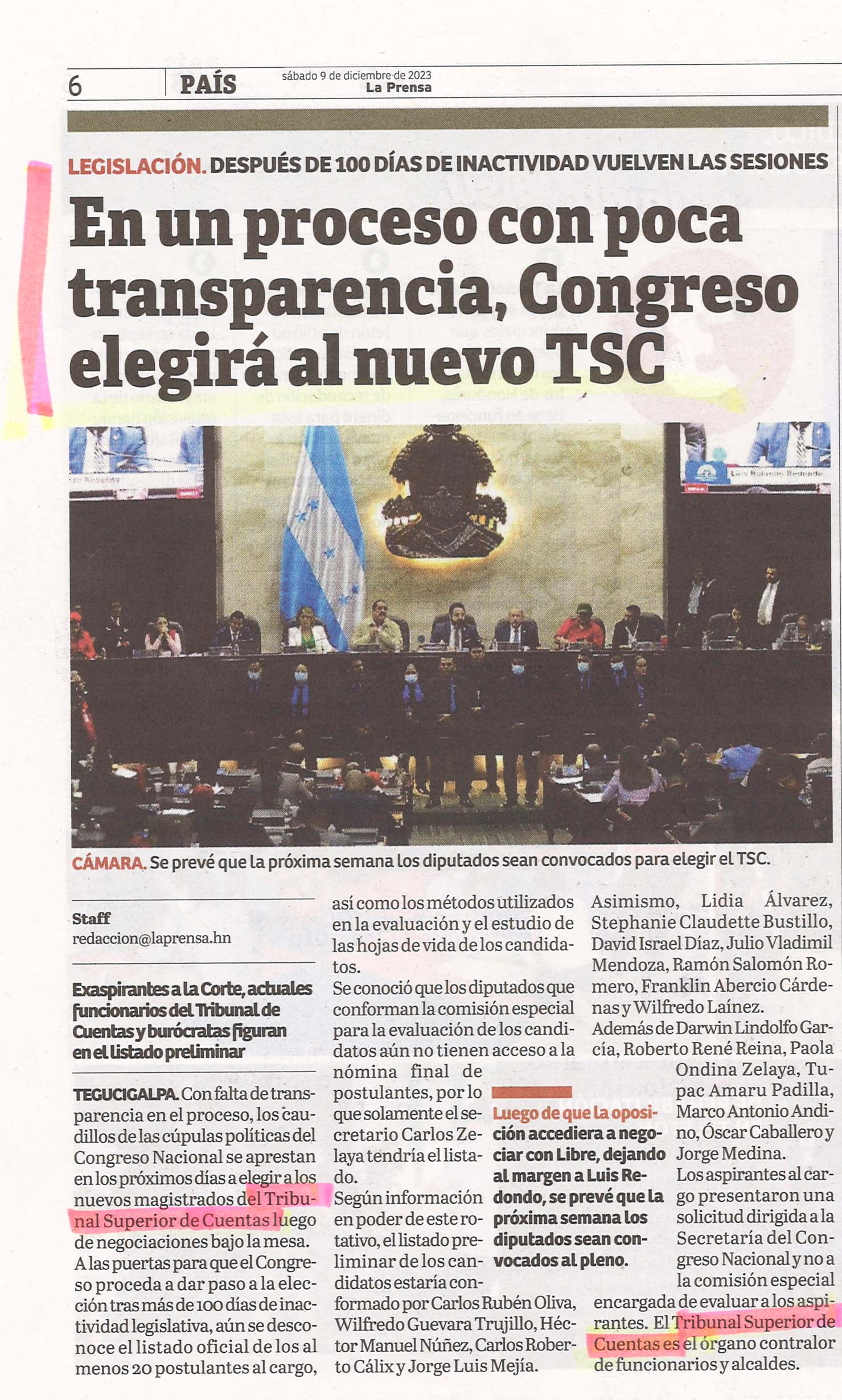 TSC En un proceso con poca transparencia, Congreso elegirá al nuevo TSC Odeth Aguilera Diario: La Prensa Fecha: 9 Diciembre 2023 Página: 6
