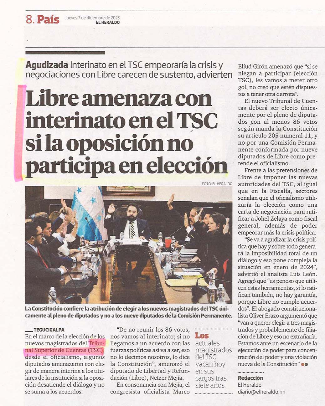 TSC Libre amenaza con interinato en el TSC si la oposición no participa en elección Odeth Aguilera Diario: El Heraldo Fecha: 7 Diciembre 2023 Página: 8