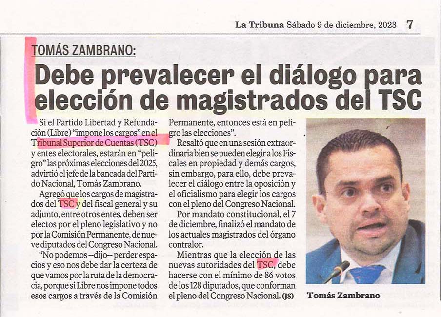 TSC TOMÁS ZAMBRANO: Debe prevalecer el diálogo para elección de magistrados del TSC Odeth Aguilera Diario: La Tribuna Fecha: 9 Diciembre 2023 Página: 7
