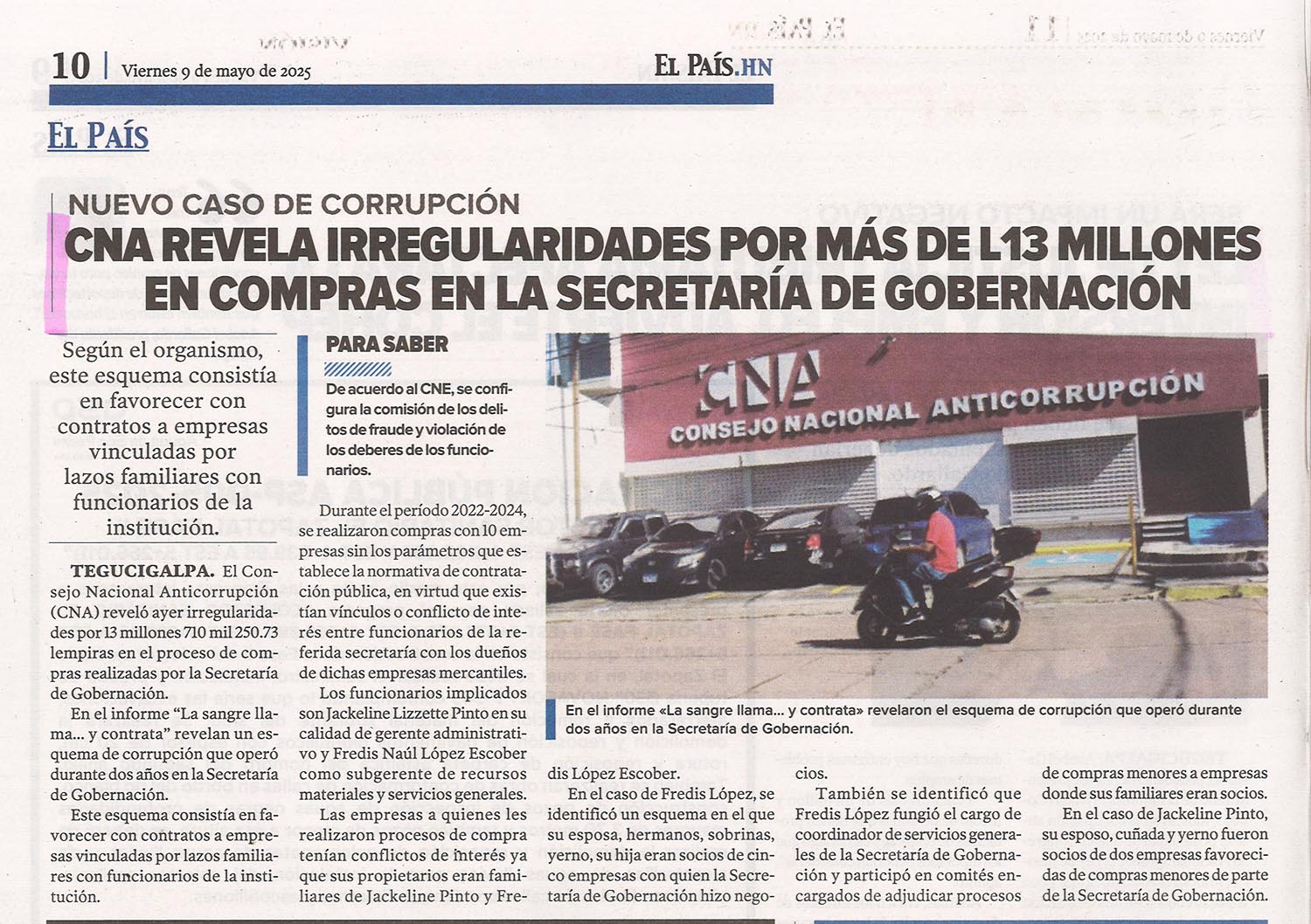 Nacionales CNA revela irregularidades por más de L13 millones en compras en la Secretaría de Gobernación Alejandra Irias Diario: El País Fecha: 9 Mayo 2025 Página: 10