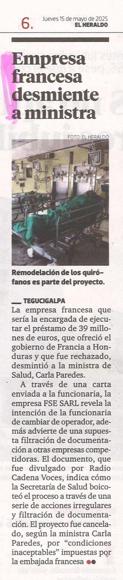 NacionalesSalud Empresa francesa desmiente a ministra Alejandra Irias Diario: El Heraldo Fecha: 15 Mayo 2025 Página: 6
