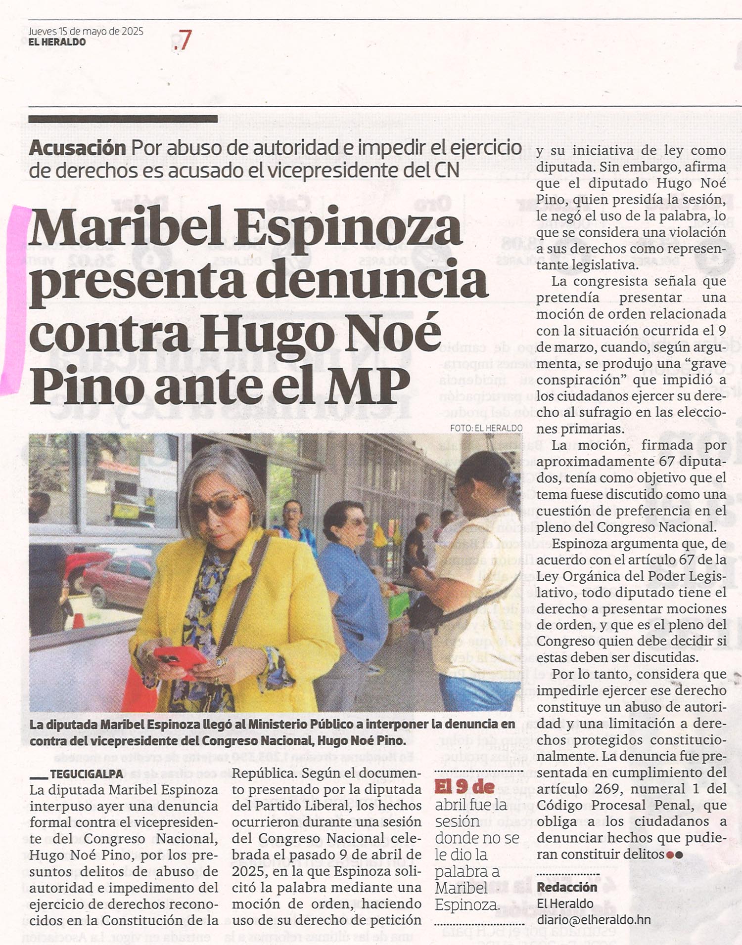 DenunciasNacionales Maribel Espinoza presenta denuncia contra Hugo Noé Pino ante el MP Alejandra Irias Diario: El Heraldo Fecha: 15 Mayo 2025 Página: 7