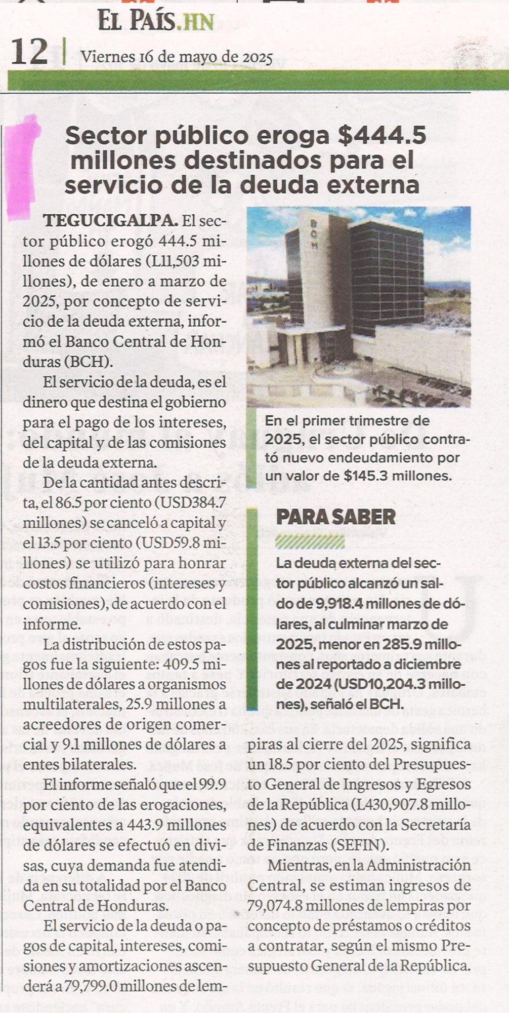 EconómicoNacionales Sector público eroga $444.5 millones destinados para el servicio de la deuda externa Alejandra Irias Diario: El País Fecha: 16 Mayo 2025 Página: 12
