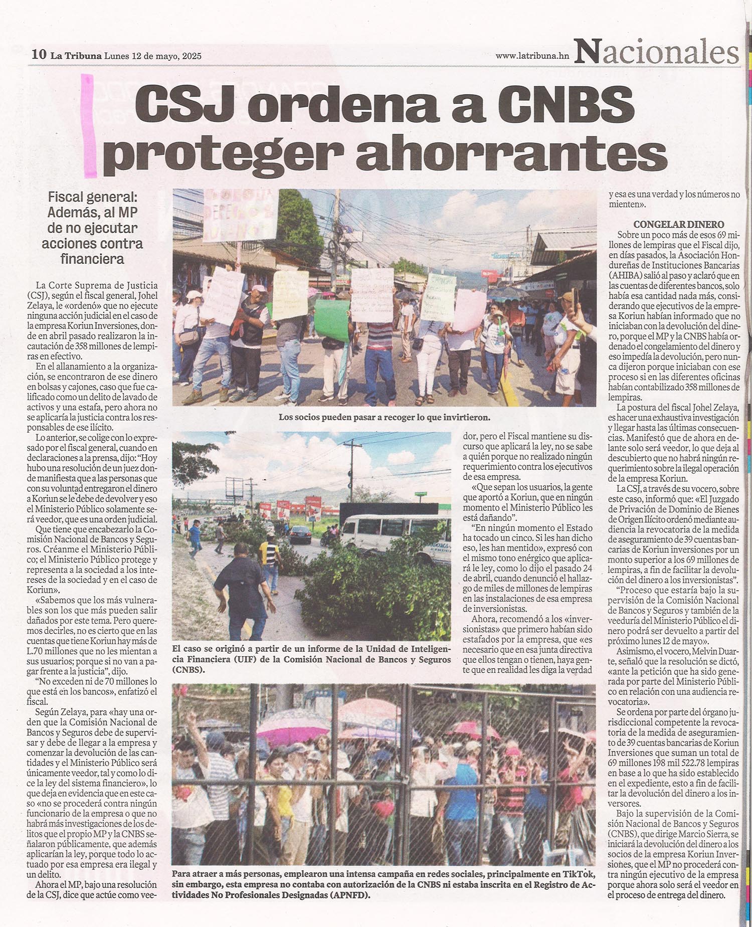 Nacionales CSJ ordena a CNBS proteger ahorrantes Alejandra Irias Diario: La Tribuna Fecha: 12 Mayo 2025 Página: 10