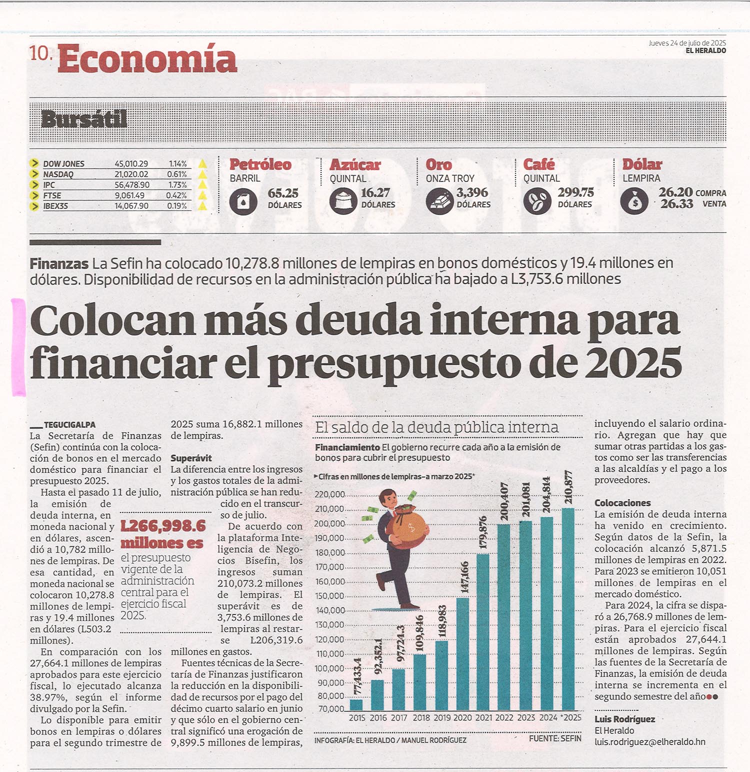 EconómicoNacionales Colocan más deuda interna para financiar el presupuesto de 2025 Alejandra Irias Diario: El Heraldo Fecha: 24 Julio 2025 Página: 10