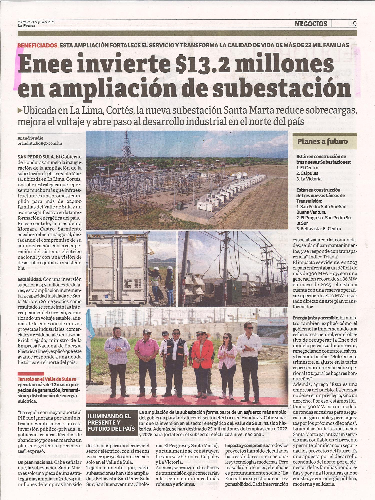 ENEENacionales Enee invierte $13.2 millones en ampliación de subestación Alejandra Irias Diario: La Prensa Fecha: 23 Julio 2025 Página: 9