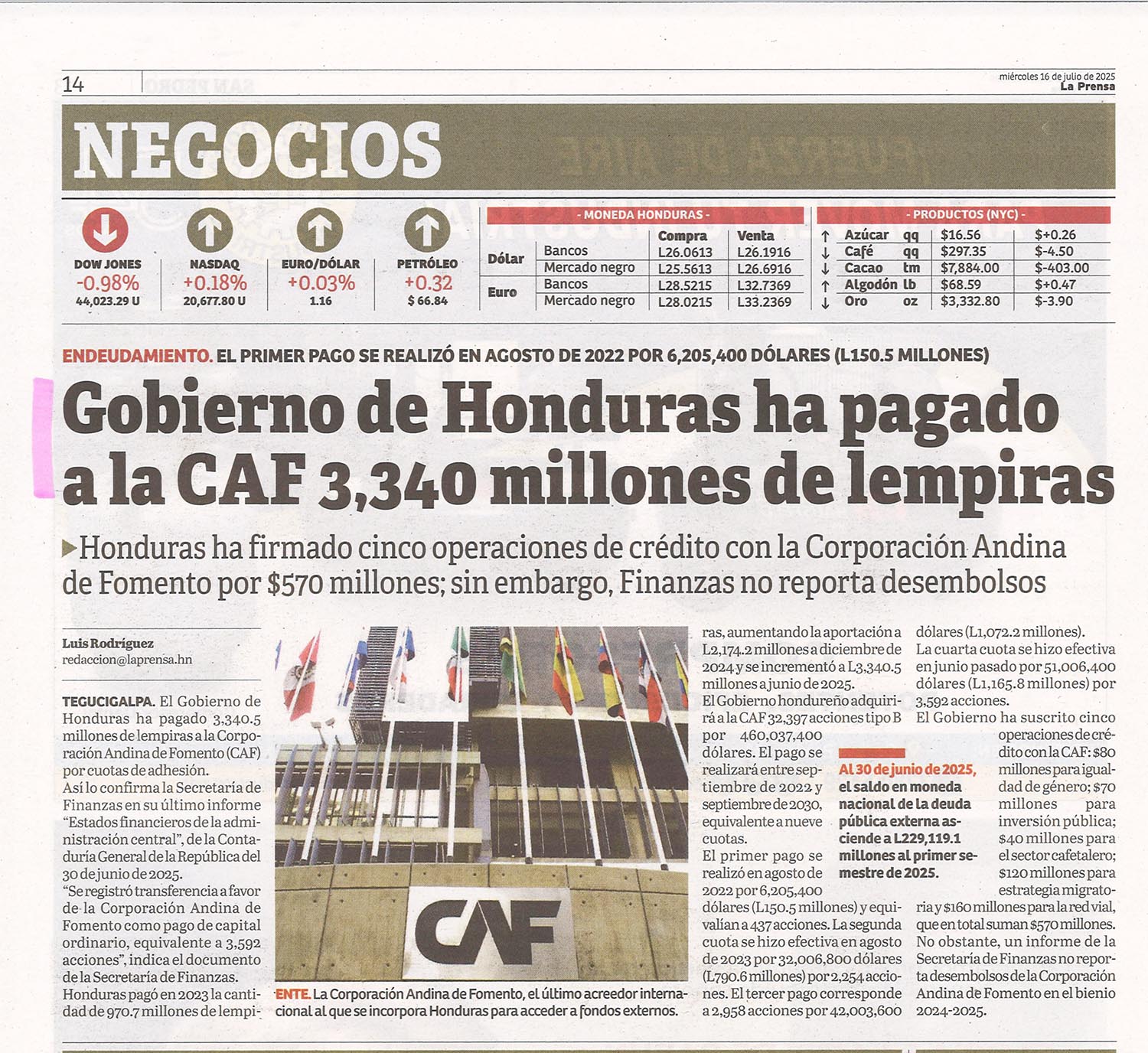 EconómicoNacionales Gobierno de Honduras ha pagado a la CAF 3,340 millones de lempiras Alejandra Irias Diario: La Prensa Fecha: 16 Julio 2025 Página: 14