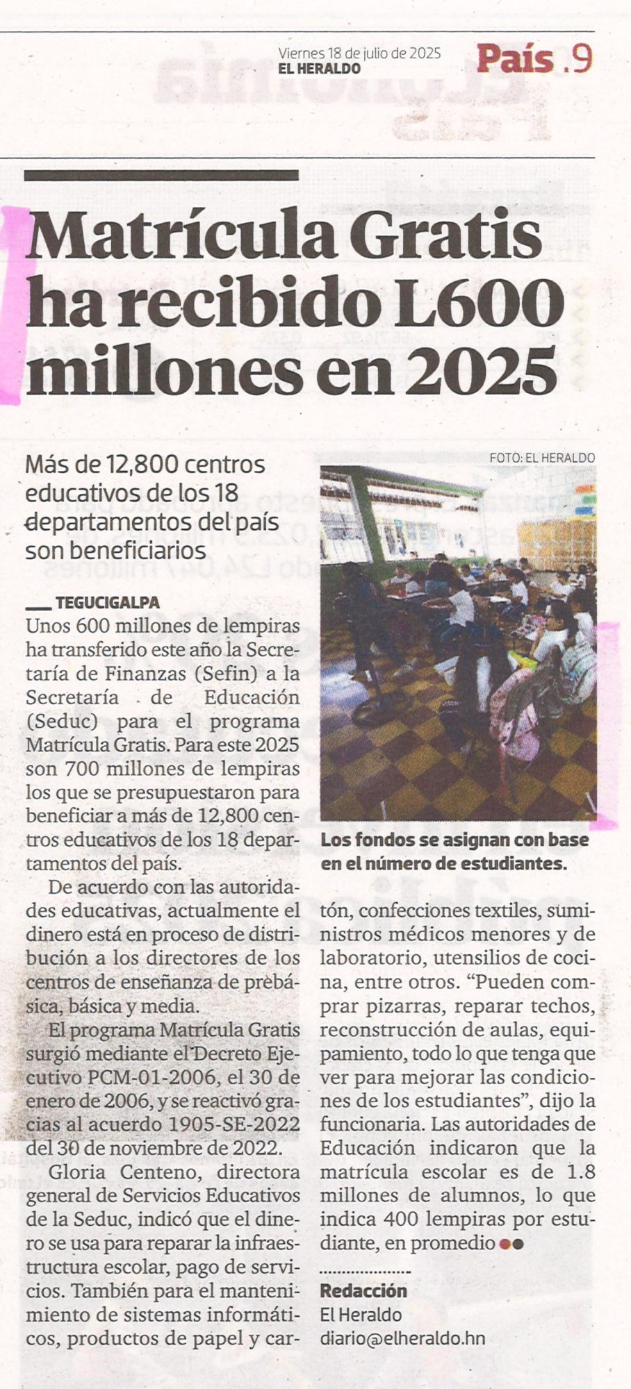 EconómicoNacionales Matrícula Gratis ha recibido L600 millones en 2025 Alejandra Irias Diario: El Heraldo Fecha: 18 Julio 2025 Página: 9