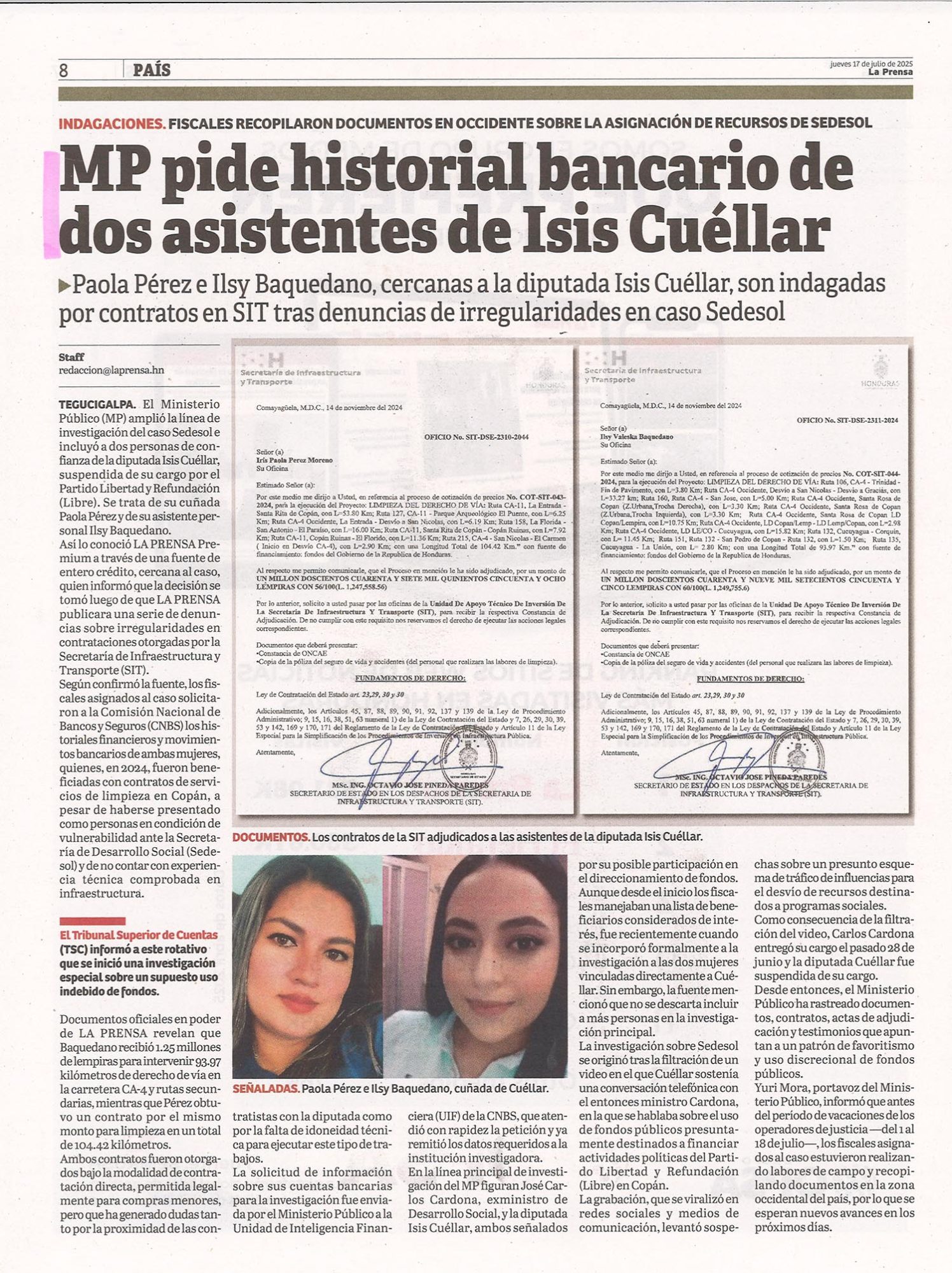 Casos EmblemáticosNacionalesPolicíaTSC MP pide historial bancario de dos asistentes de Isis Cuéllar Alejandra Irias Diario: La Prensa Fecha: 17 Julio 2025 Página: 8
