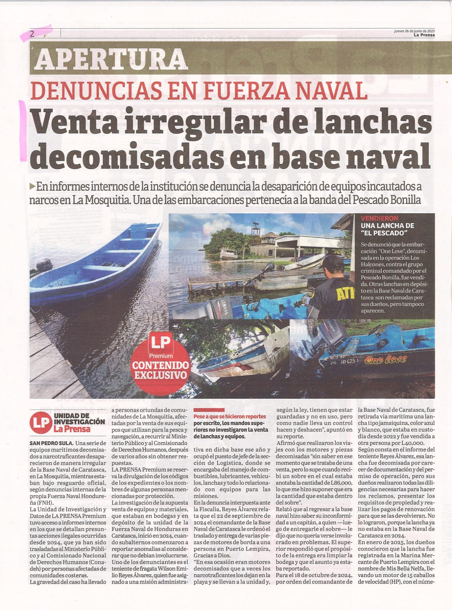 Nacionales Venta irregular de lanchas decomisadas en base naval Meredith Andino Diario: La Prensa Fecha: 26 de junio de 2025 Página: 2