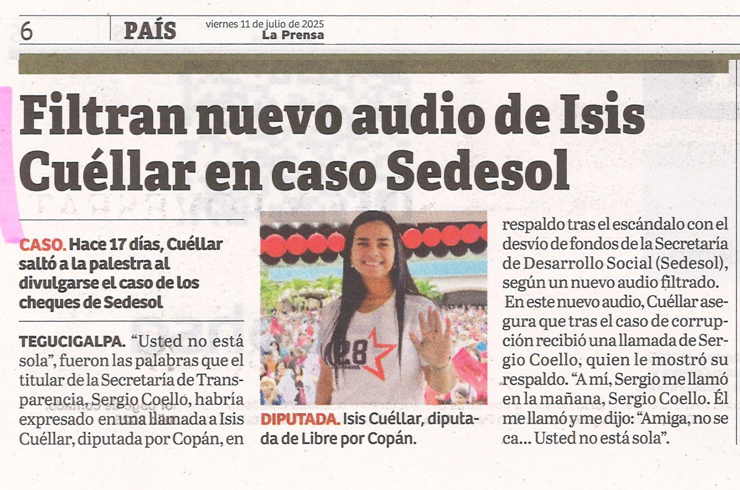 Casos EmblemáticosNacionales Filtran nuevo audio de Isis Cuéllar en caso Sedesol Alejandra Irias Diario: La Prensa Fecha: 11 Julio 2025 Página: 6