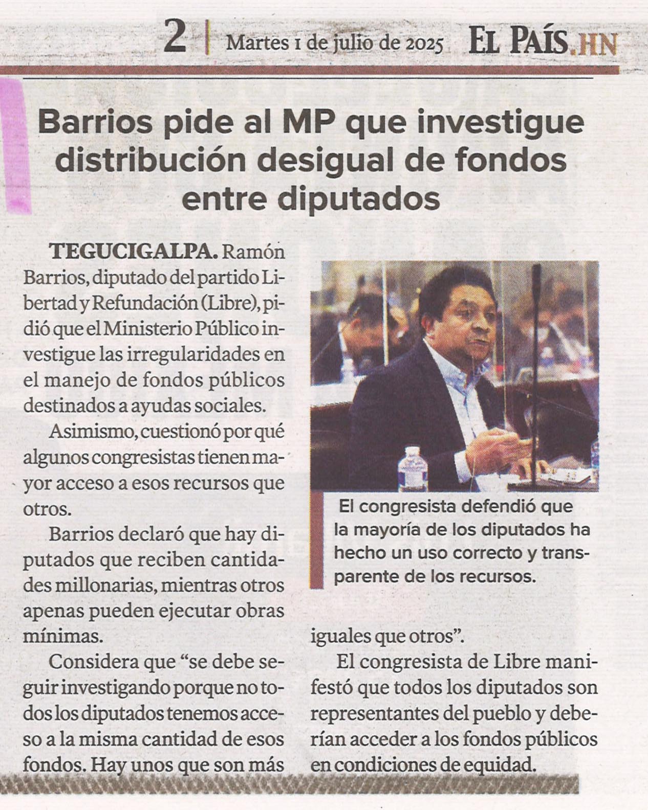 Sin categoría Barrios pide al MP que investigue distribución desigual de fondos entre diputados Meredith Andino Diario: El País Fecha: 1 de julio de 2025 Página: 2