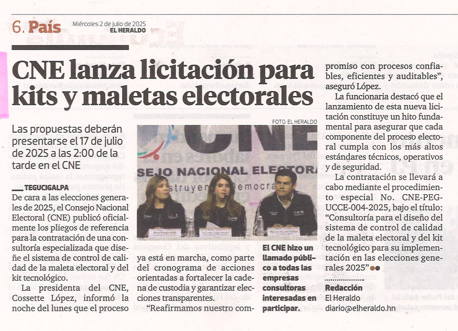 LicitacionesNacionales CNE lanza licitación para kits y maletas electorales Meredith Andino Diario: El Heraldo Fecha: 2 de julio de 2025 Página: 6
