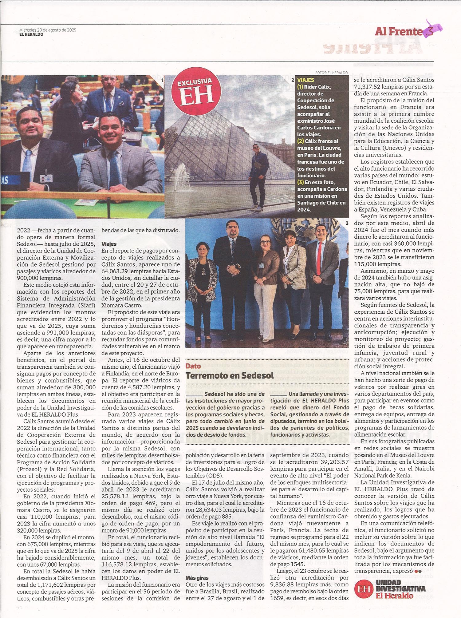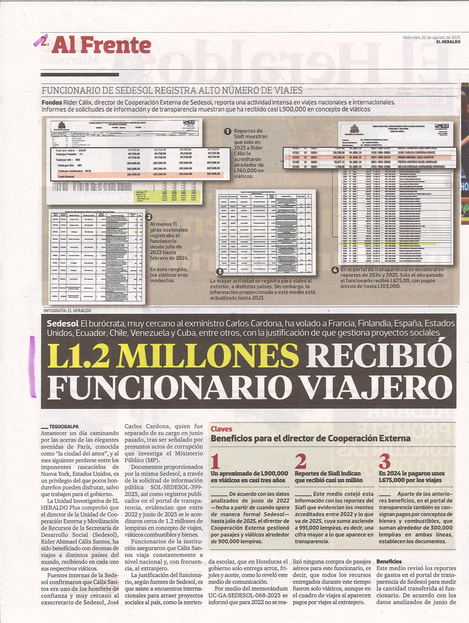 Casos EmblemáticosNacionales L1.2 millones recibió funcionario viajero Alejandra Irias Diario: El Heraldo Fecha: 20 Agosto 2025 Páginas: 2 y 3