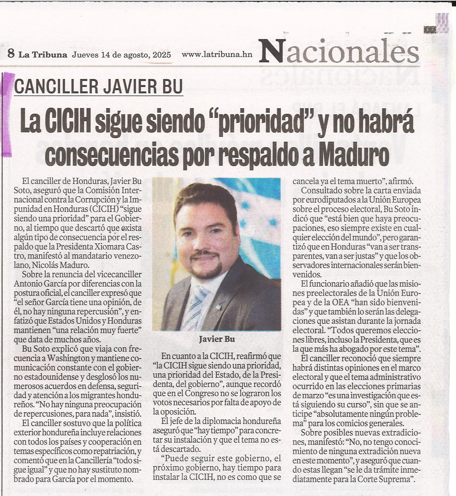 Nacionales CANCILLER JAVIER BU La CICIH sigue siendo «prioridad” y no habrá consecuencias por respaldo a Maduro Meredith Andino Diario: La Tribuna Fecha: 14 de agosto, 2025 Página: 8