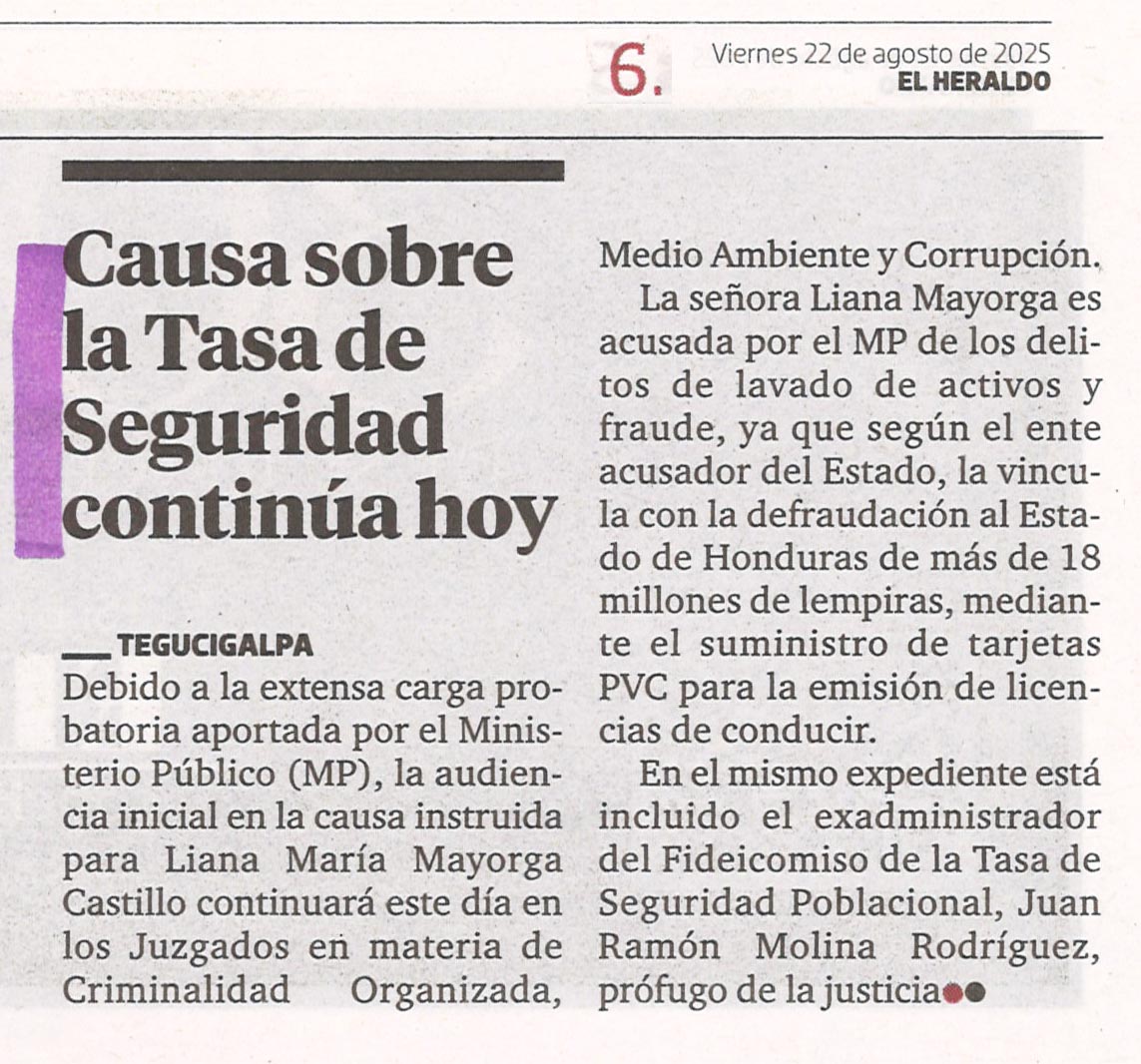 Sin categoría Causa sobre la Tasa de Seguridad continúa hoy Meredith Andino Diario: El Heraldo Fecha: 22 de agosto de 2025 Página: 6