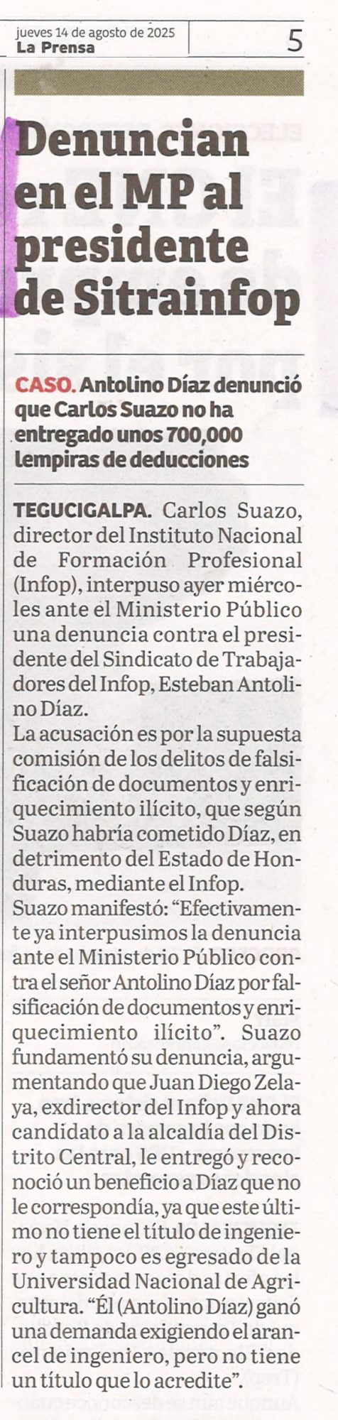 Sin categoría Denuncian en el MP al presidente de Sitrainfop Meredith Andino Diario: La Prensa Fecha: 14 de agosto de 2025 Página: 5