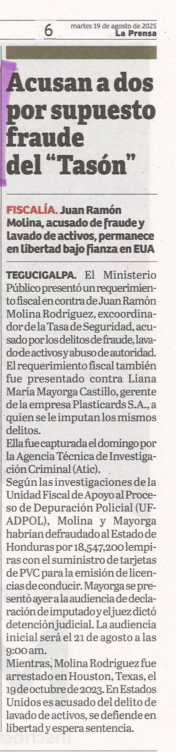 Sin categoría Acusan a dos por supuesto fraude del «Tasón» Meredith Andino Diario: La Prensa Fecha: 19 de agosto de 2025 Página: 6