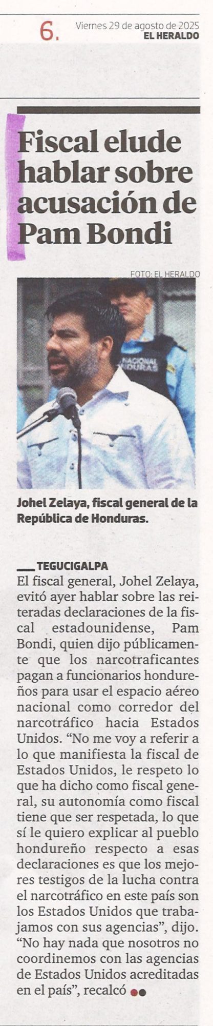 Sin categoría Fiscal elude hablar sobre acusación de Pam Bondi Meredith Andino Diario: El Heraldo Fecha: 29 de agosto de 2025 Página: 6