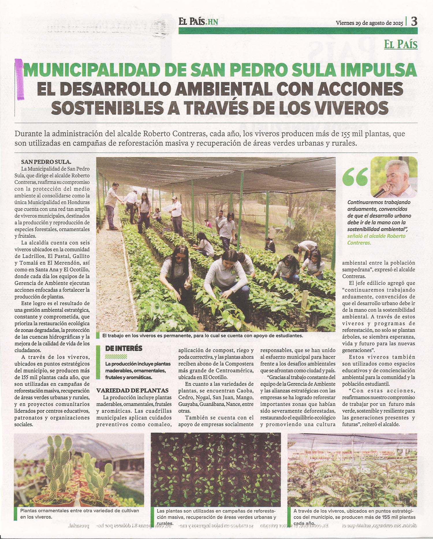 Municipalidades MUNICIPALIDAD DE SAN PEDRO SULA IMPULSA EL DESARROLLO AMBIENTAL CON ACCIONES SOSTENIBLES A TRAVÉS DE LOS VIVEROS Meredith Andino Diario: El País Fecha: 29 de agosto de 2025 Página: 3