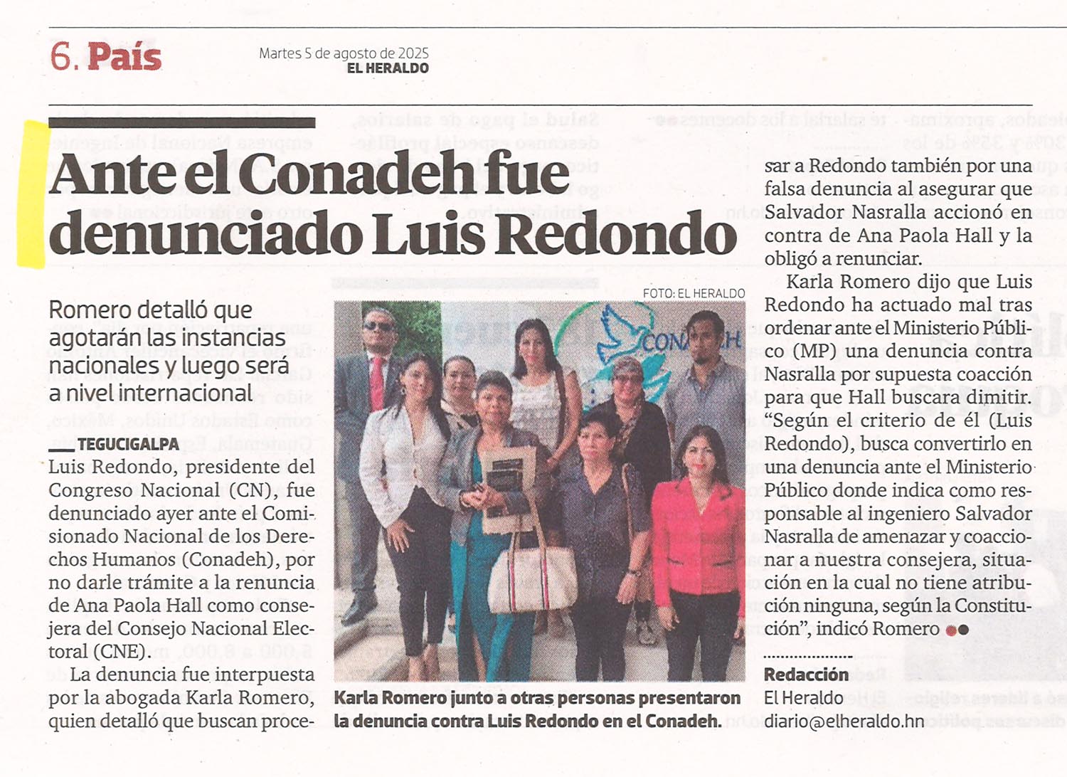 Sin categoría Ante el Conadeh fue denunciado Luis Redondo Meredith Andino Diario: El Heraldo Fecha: 5 de agosto de 2025 Página: 6