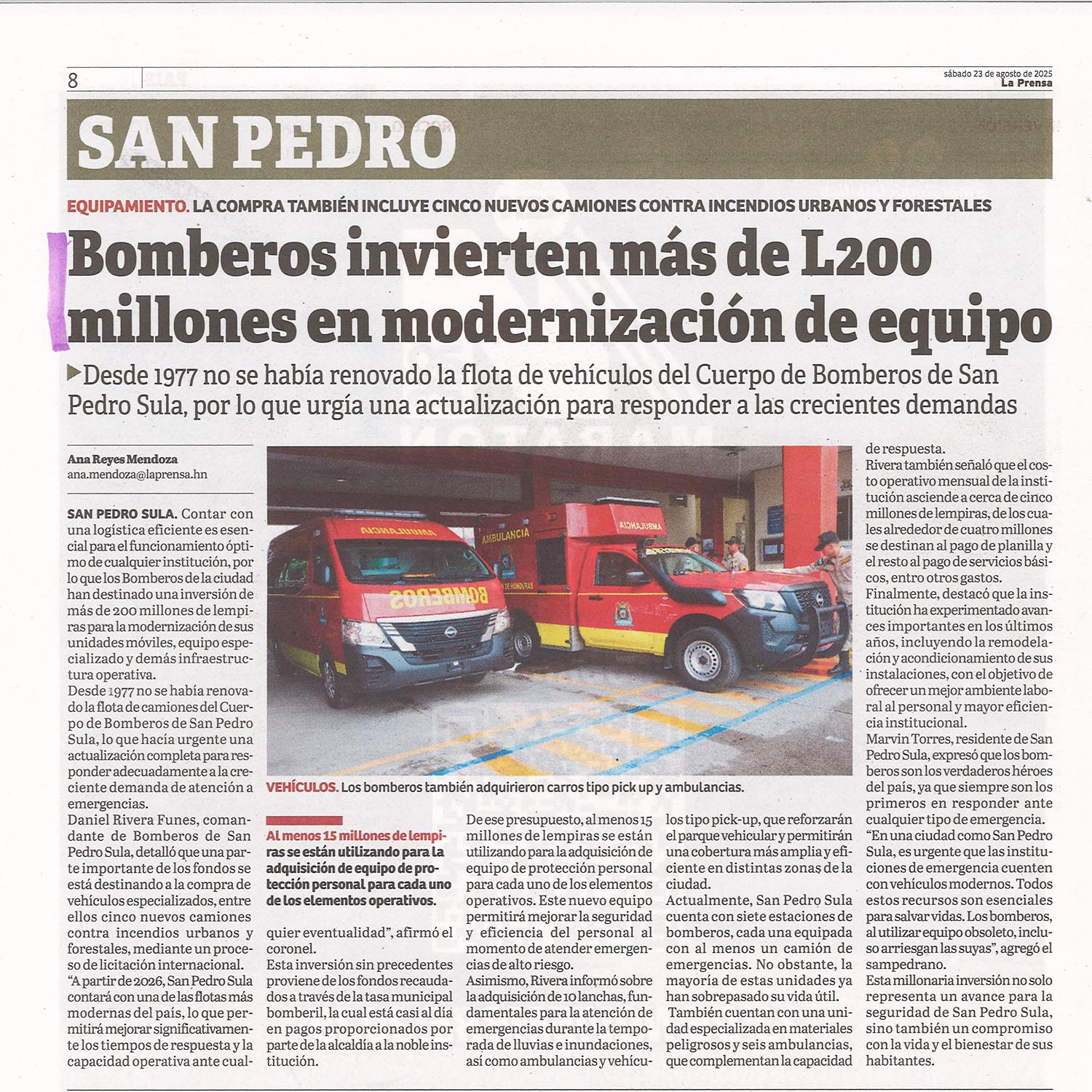 Nacionales Bomberos invierten más de L200 millones en modernización de equipo Meredith Andino Diario: La Prensa Fecha: 23 de agosto de 2025 Página: 8