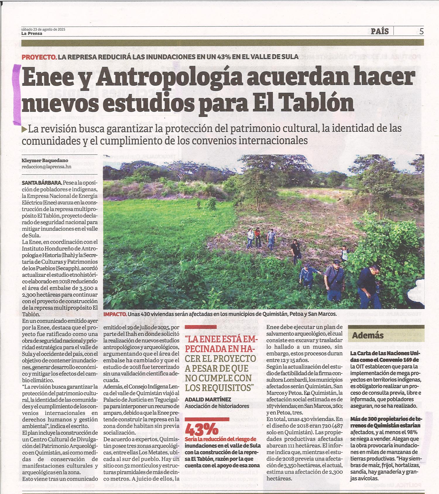 Sin categoría Enee y Antropología acuerdan hacer nuevos estudios para El Tablón Meredith Andino Diario: La Prensa Fecha: 23 de agosto de 2025. Página: 5