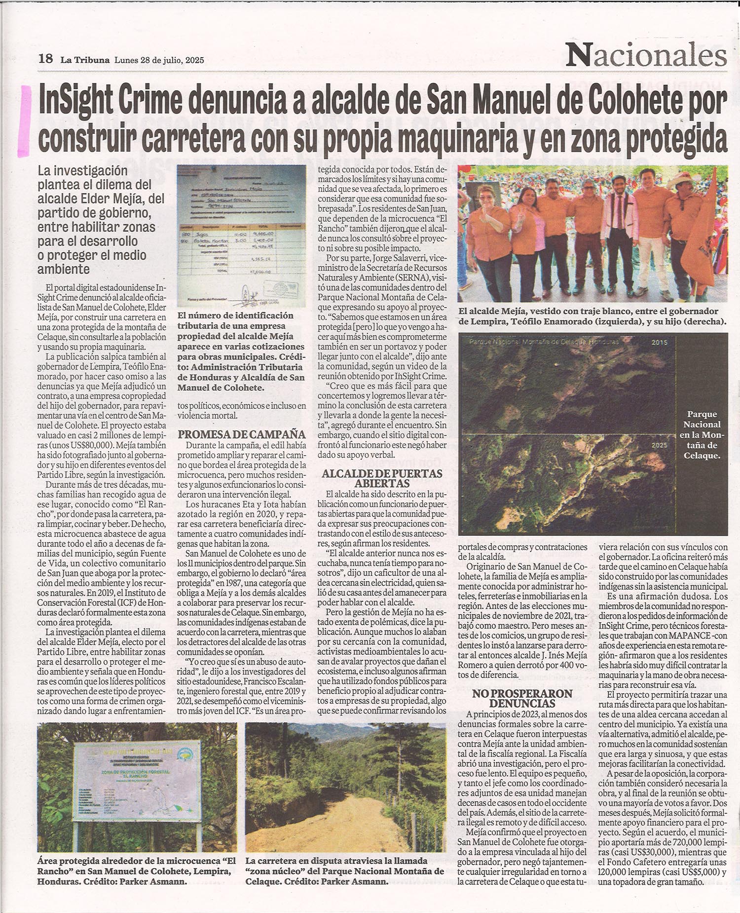 AmbienteDenunciasNacionales InSight Crime denuncia a alcalde de San Manuel de Colohete por construir carretera con su propia maquinaria y en zona protegida Alejandra Irias Diario: La Tribuna Fecha: 28 Julio 2025 Página: 18