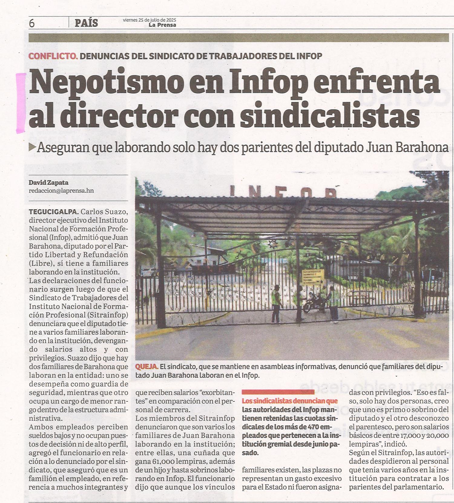 Nacionales Nepotismo en Infop enfrenta al director con sindicalistas Meredith Andino Diario: La Prensa Fecha: 25 de julio de 2025 Página: 6