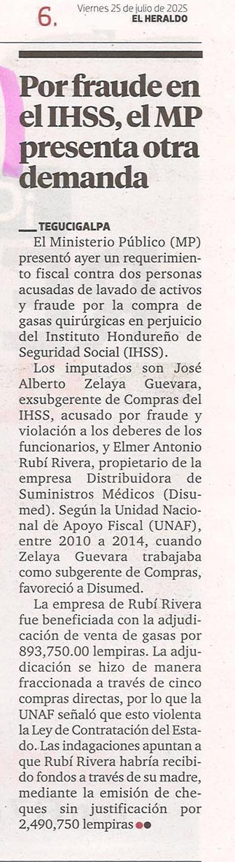 Nacionales Por fraude en el IHSS, el MP presenta otra demanda. Meredith Andino Diario: El Heraldo Fecha: 25 de julio de 2025 Página: 6