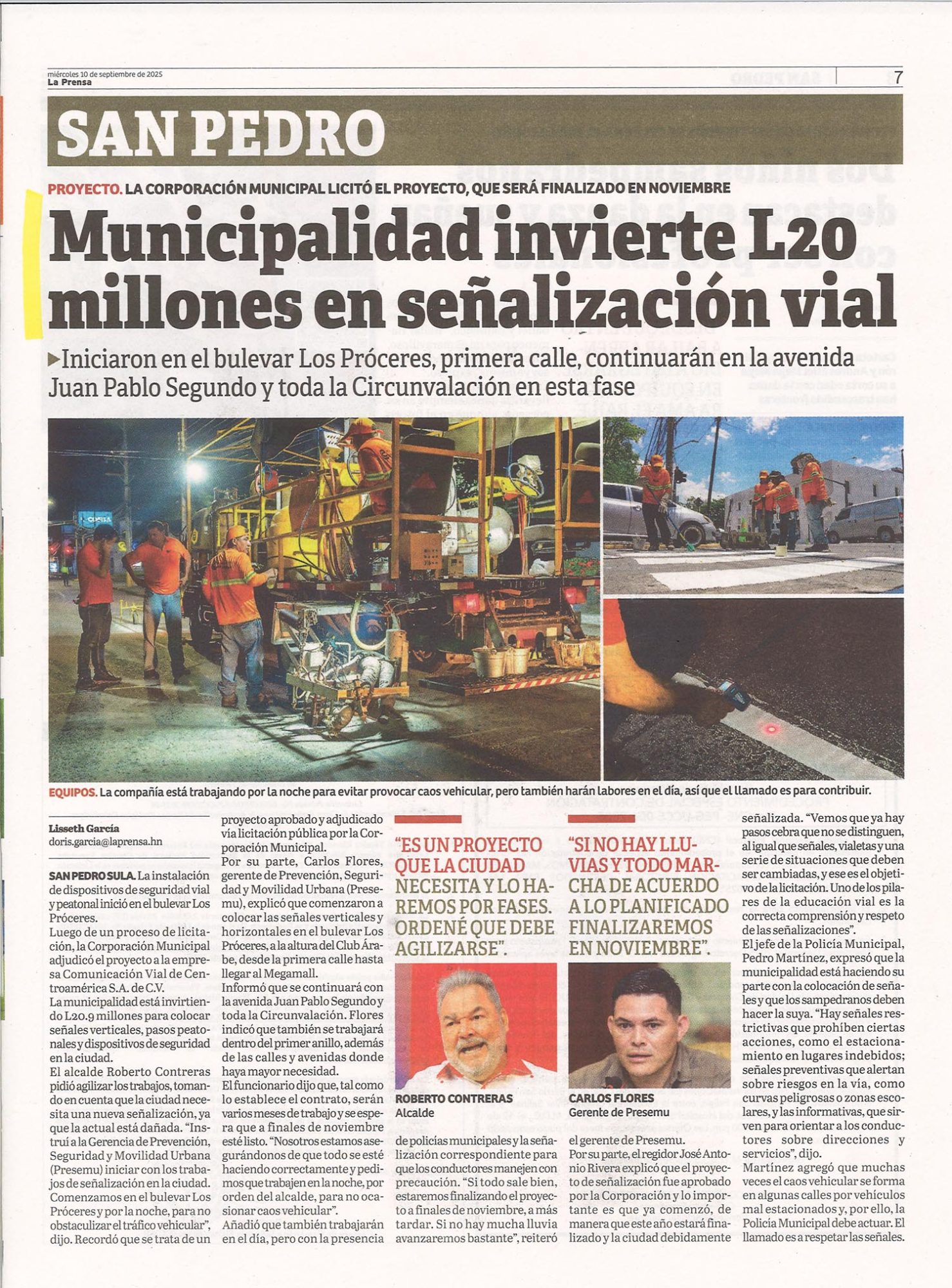 Municipalidades Municipalidad invierte L20 millones en señalización vial. Meredith Andino Diario: La Prensa Fecha: 10 de septiembre de 2025 Página: 7