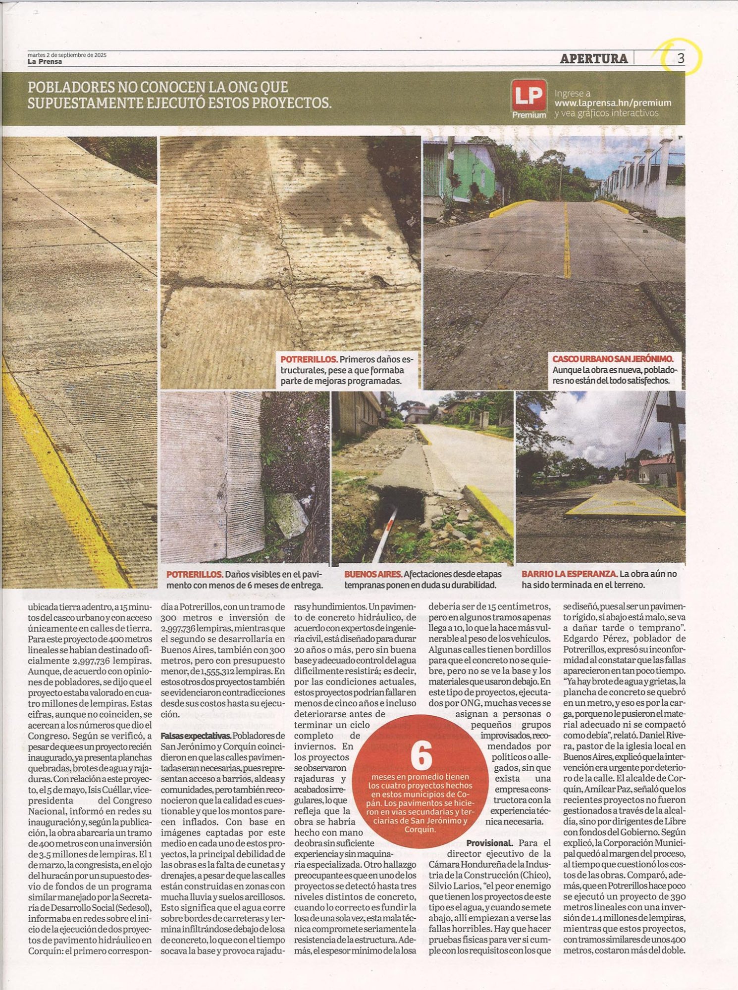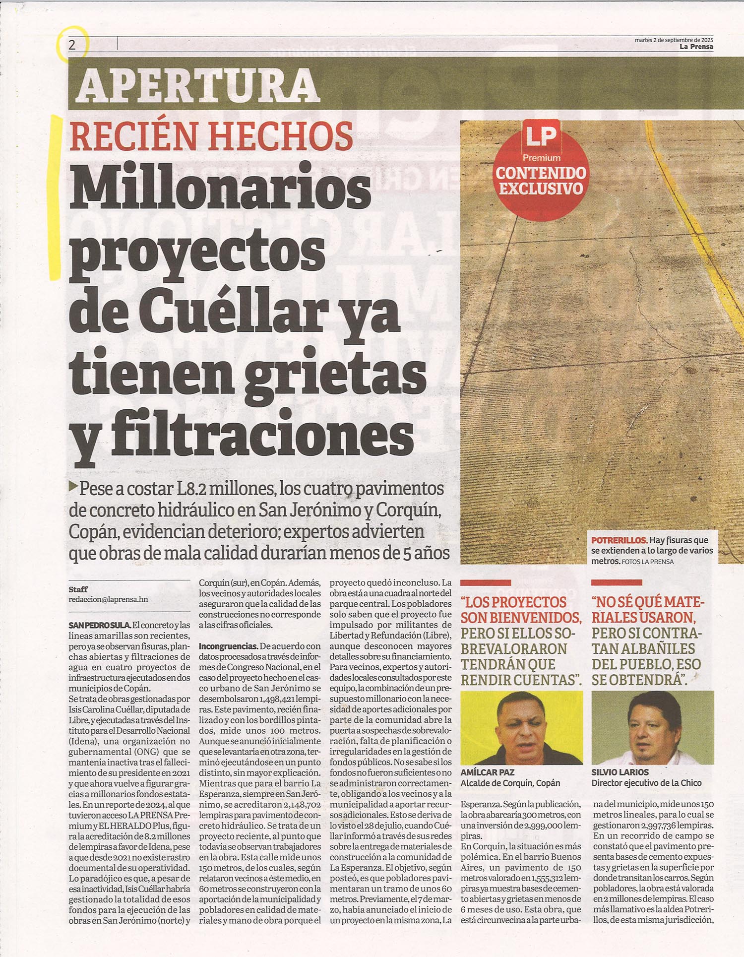 Nacionales Millonarios proyectos de Cuéllar ya tienen grietas y filtraciones. Meredith Andino Diario: La Prensa Fecha: 2 de septiembre de 2025 Página: 2