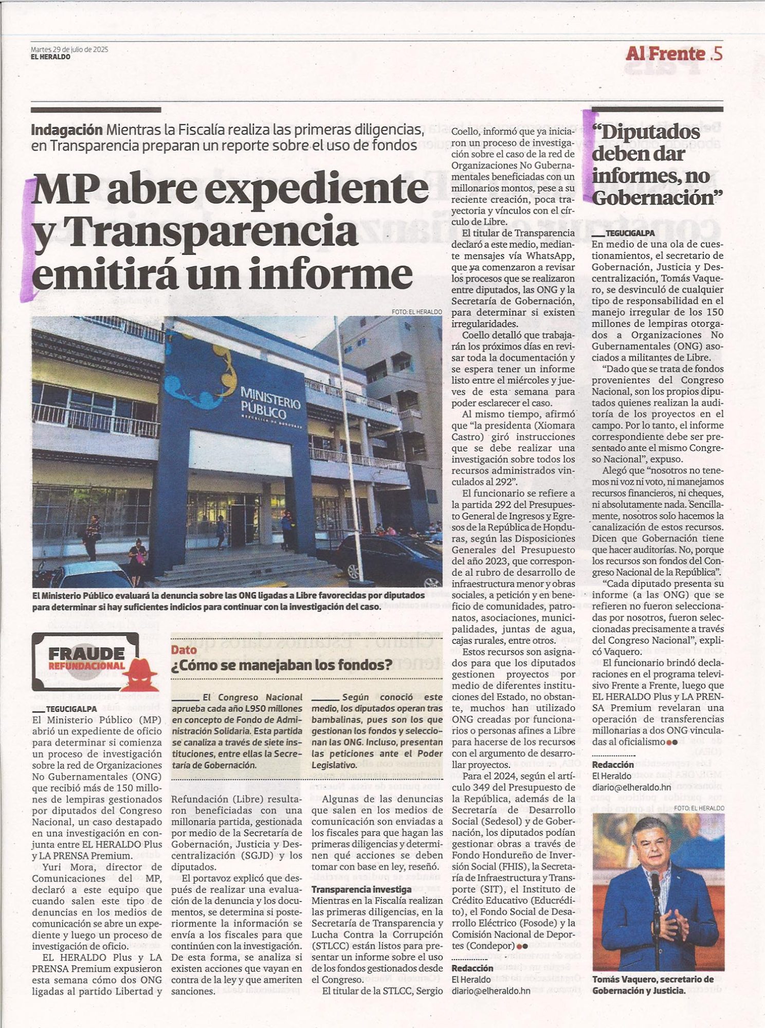Nacionales MP abre expediente y Transparencia emitirá un informe Alejandra Irias Diario: El Heraldo Otros Titulares: «Diputados deben dar informes, no Gobernación» Fecha: 29 Julio 2025 Página: 5