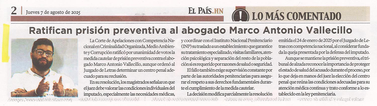 NacionalesPolicía Ratifican prisión preventiva al abogado Marco Antonio Vallecillo Alejandra Irias Diario: El País Fecha: 7 Agosto 2025 Página: 2