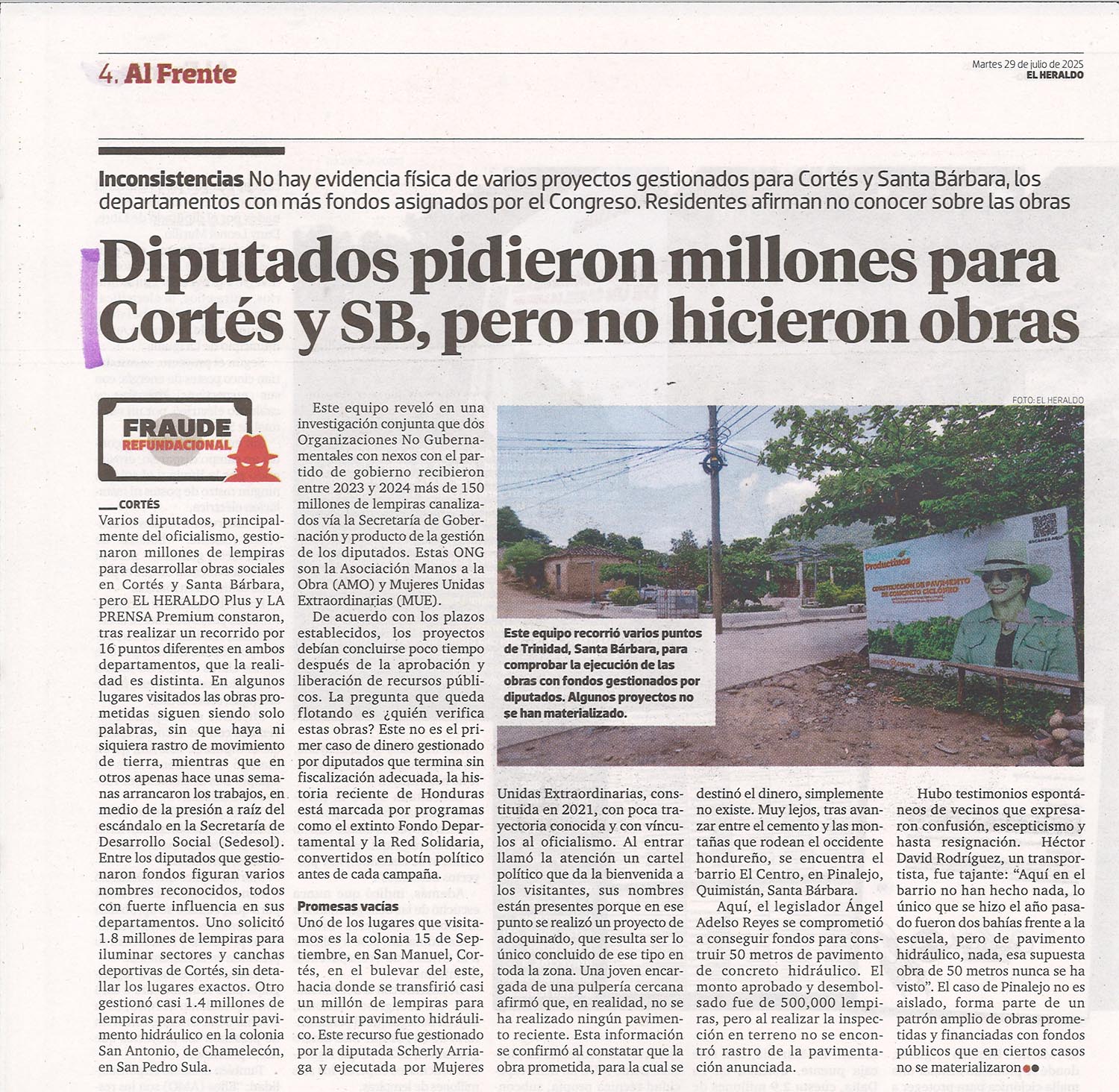 DenunciasNacionalesSin categoría Diputados pidieron millones para Cortés y SB, pero no hicieron obras Alejandra Irias Diario: El Heraldo Fecha: 29 Julio 2025 Página: 4