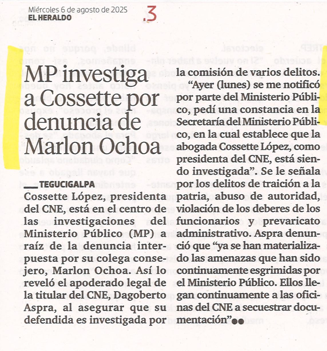 Casos EmblemáticosDenunciasNacionales MP investiga a Cossette por denuncia de Marlon Ochoa Alejandra Irias Diario: El Heraldo Fecha: 6 Agosto 2025 Página: 3