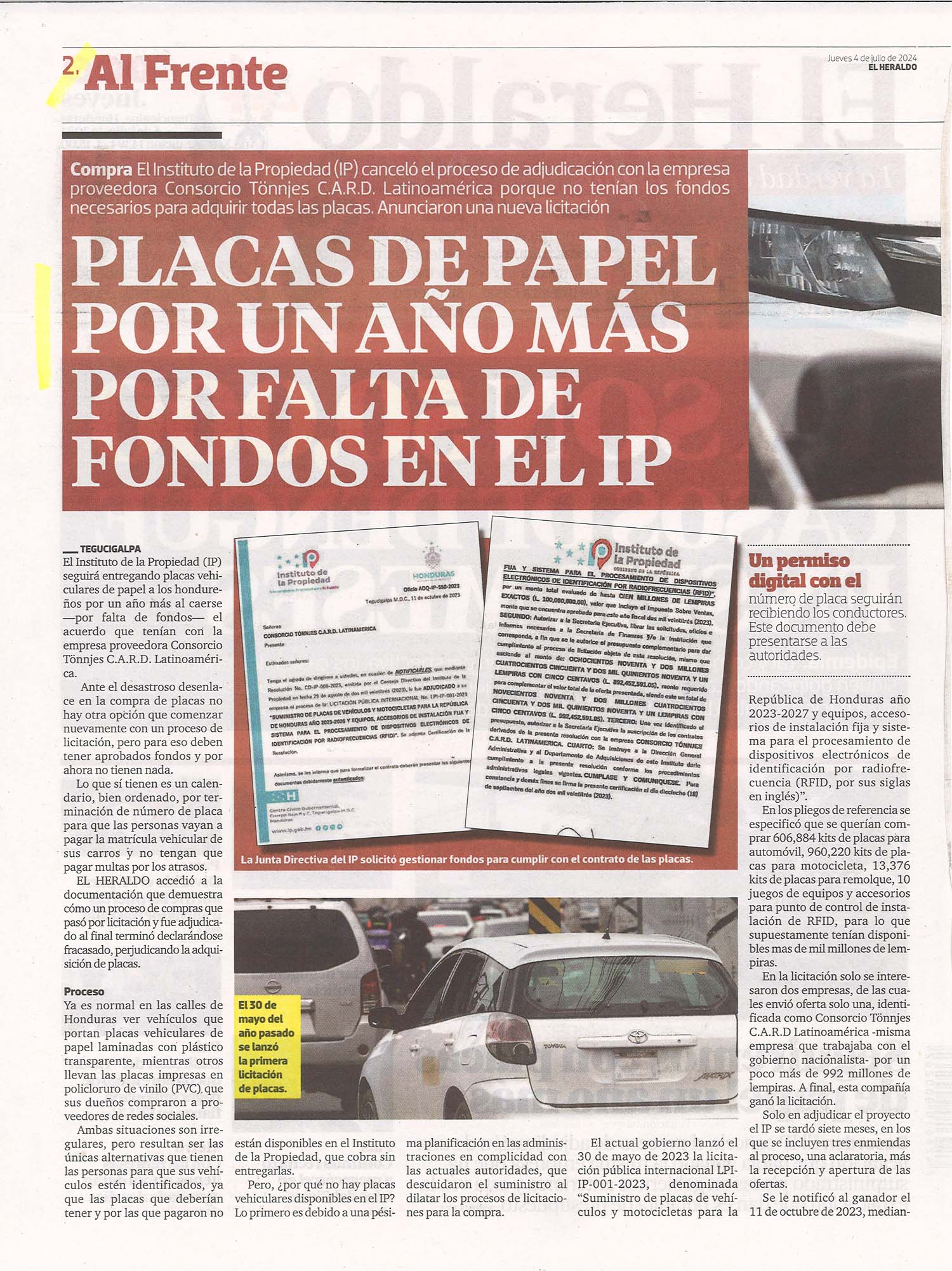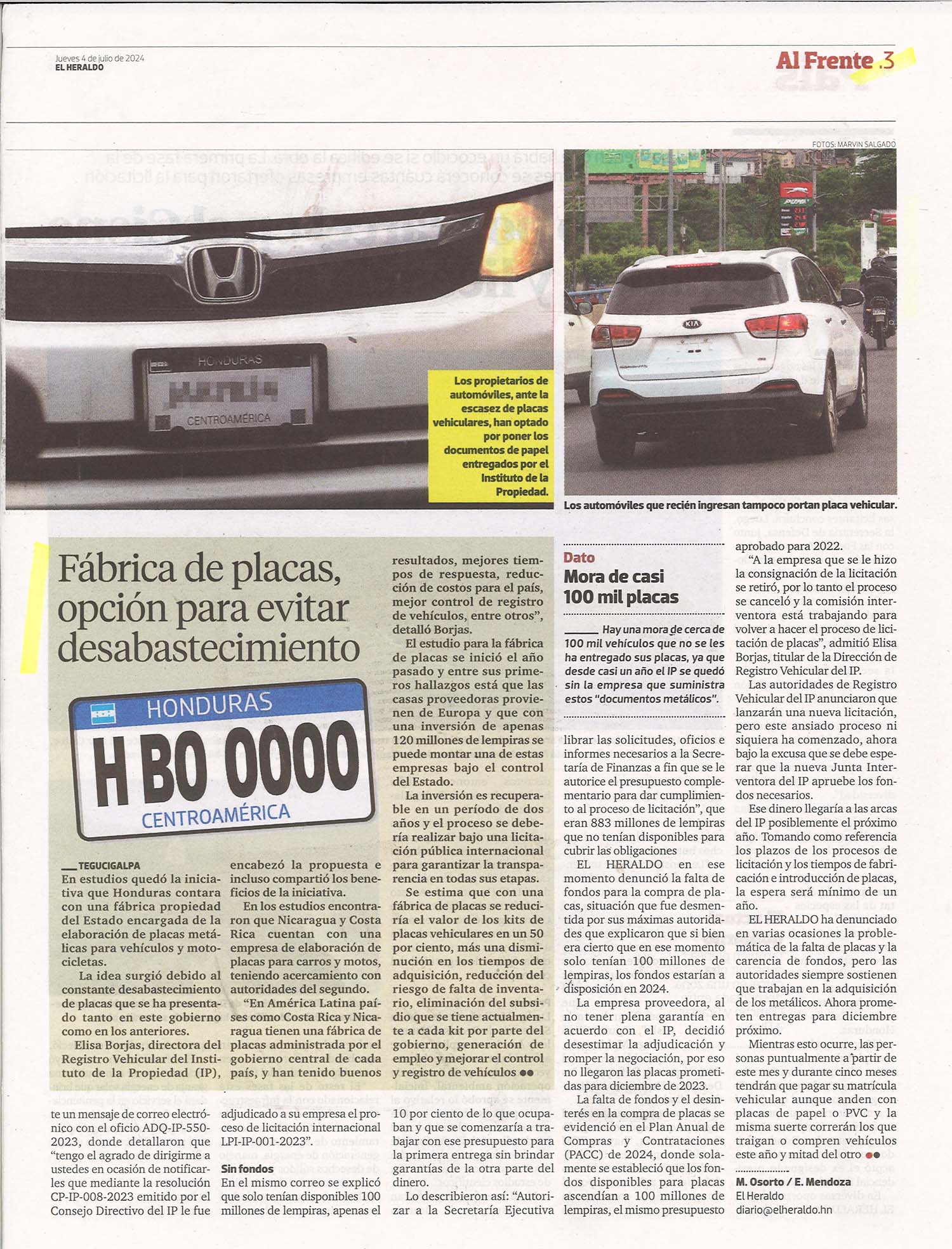 Nacionales Placas de papel por un año más por falta de fondos en el IP Odeth Aguilera Diario: El Heraldo Fecha: 4 julio 2024 Otros titulares: Fábrica de placas, opción para evitar desabastecimiento Páginas: 2 y 3