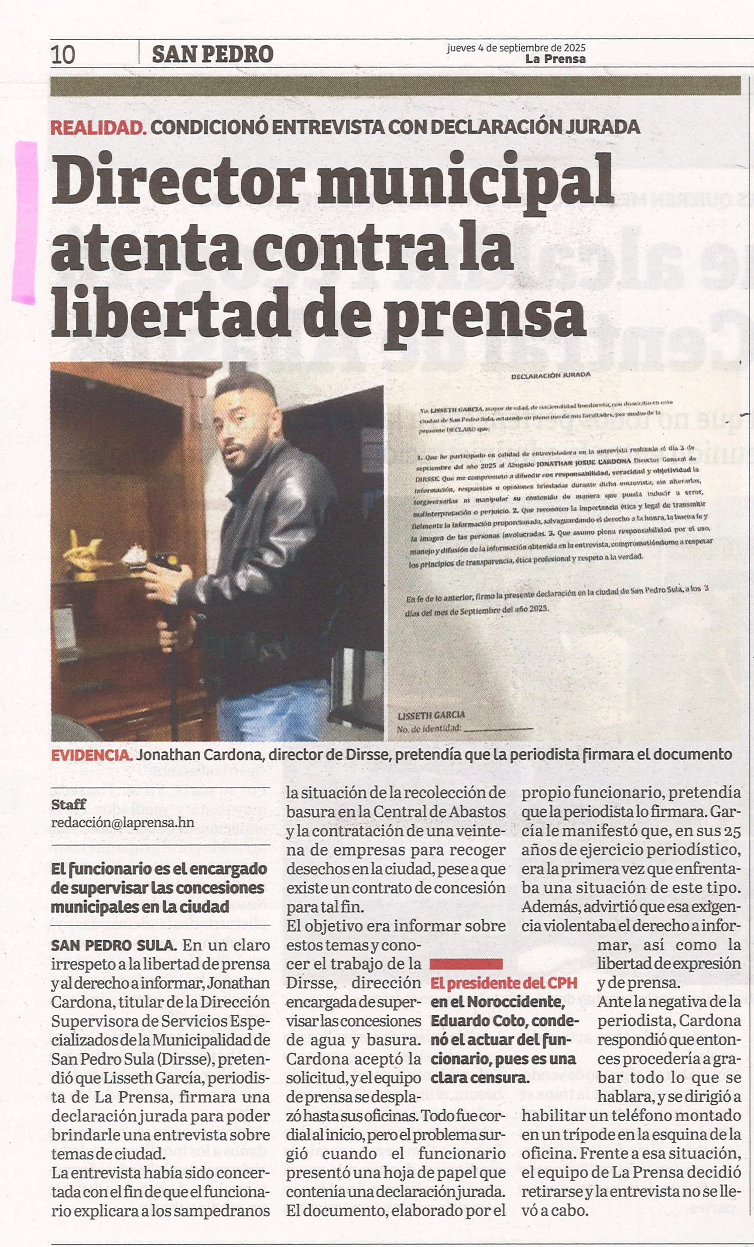 DenunciasNacionales Director municipal atenta conta libertal de prensa Alejandra Irias Diario: La Prensa Fecha: 4 Septiembre 2025 Página: 10