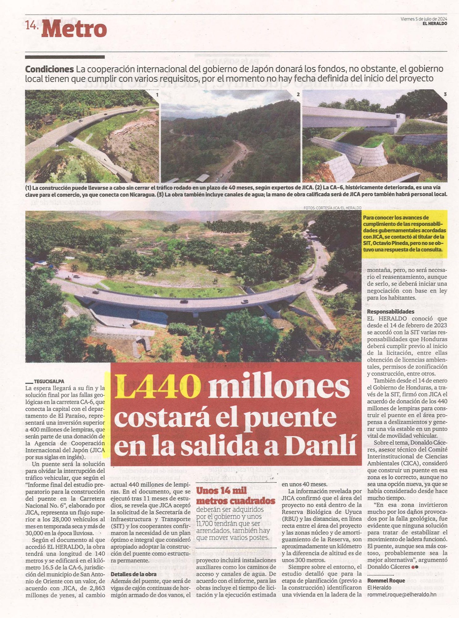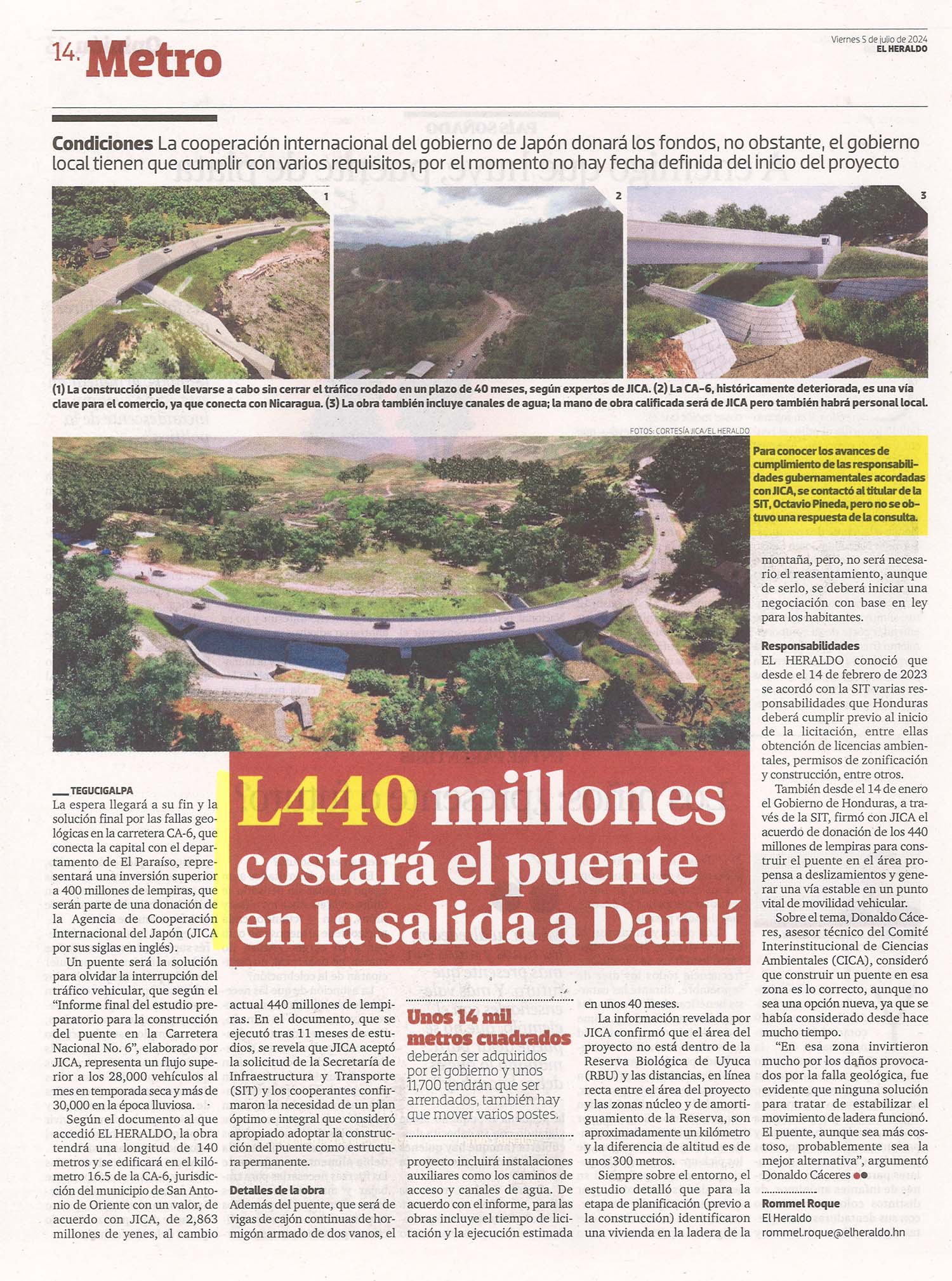 Nacionales L440 millones costará el puente en la salida a Danlí Odeth Aguilera Diario: El Heraldo Fecha: 5 julio 2024 Página: 14