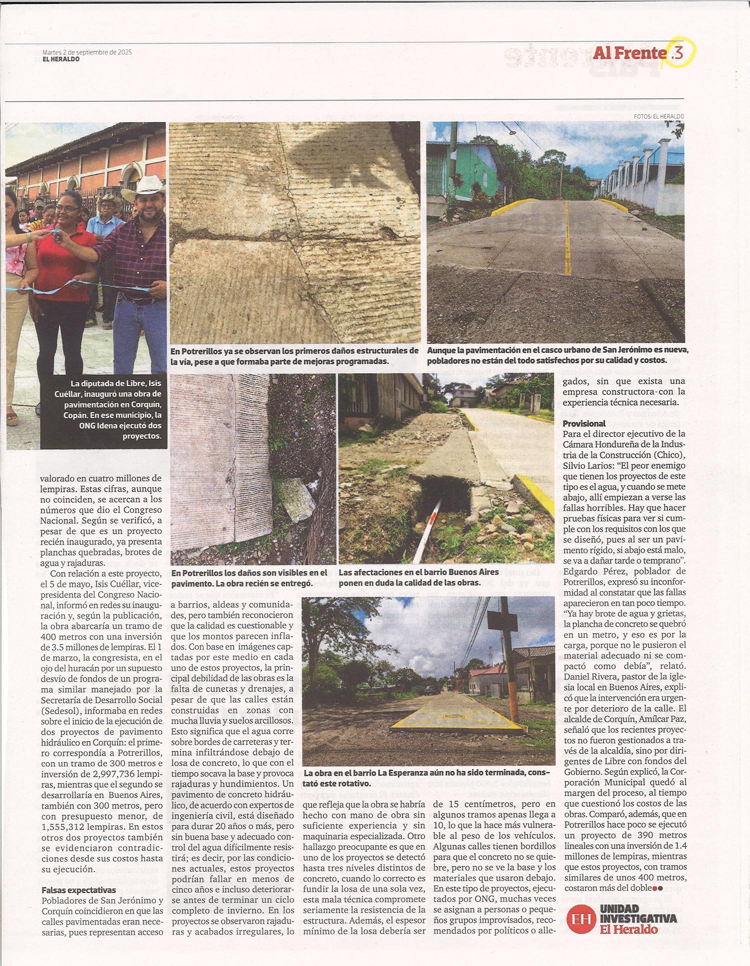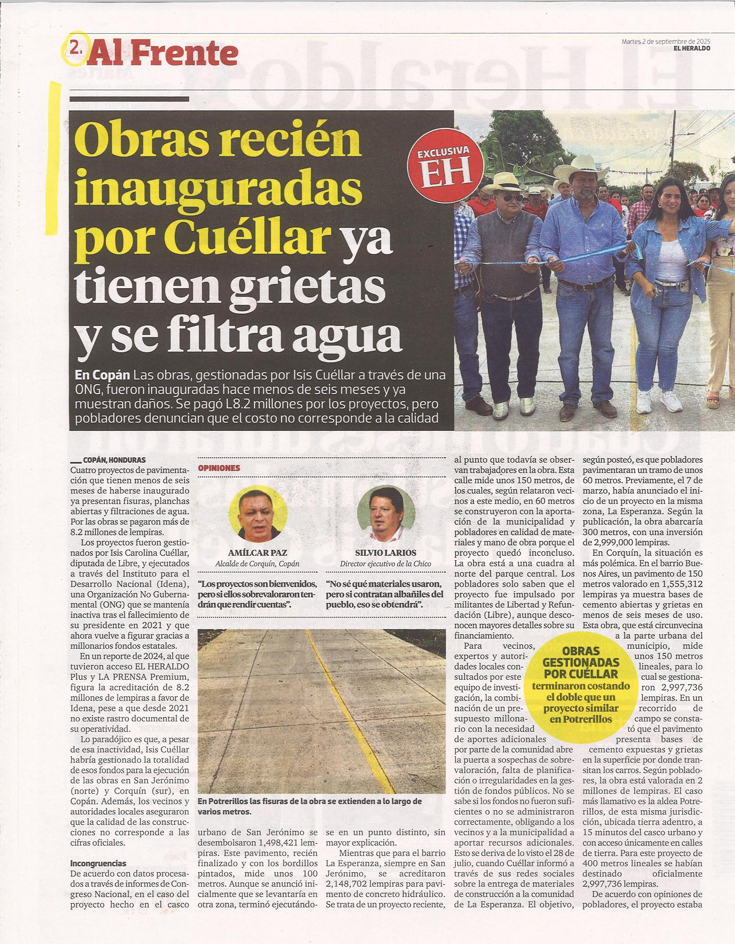 MunicipalidadesNacionales Obras recién inauguradas por Cuéllar ya tienen grietas y se filtra agua. Meredith Andino Diario: El Heraldo Fecha: 2 de septiembre de 2025 Páginas: 2-3