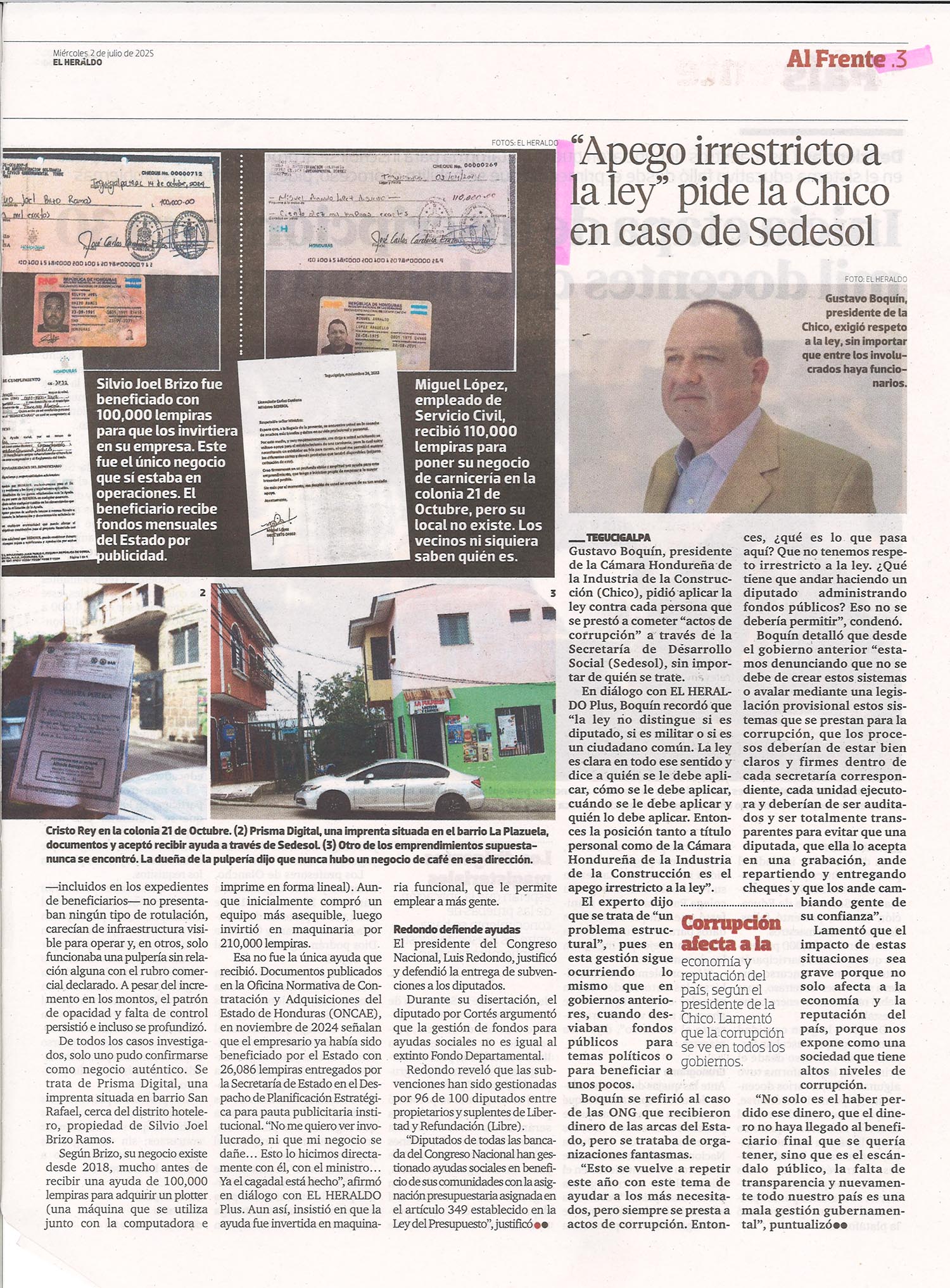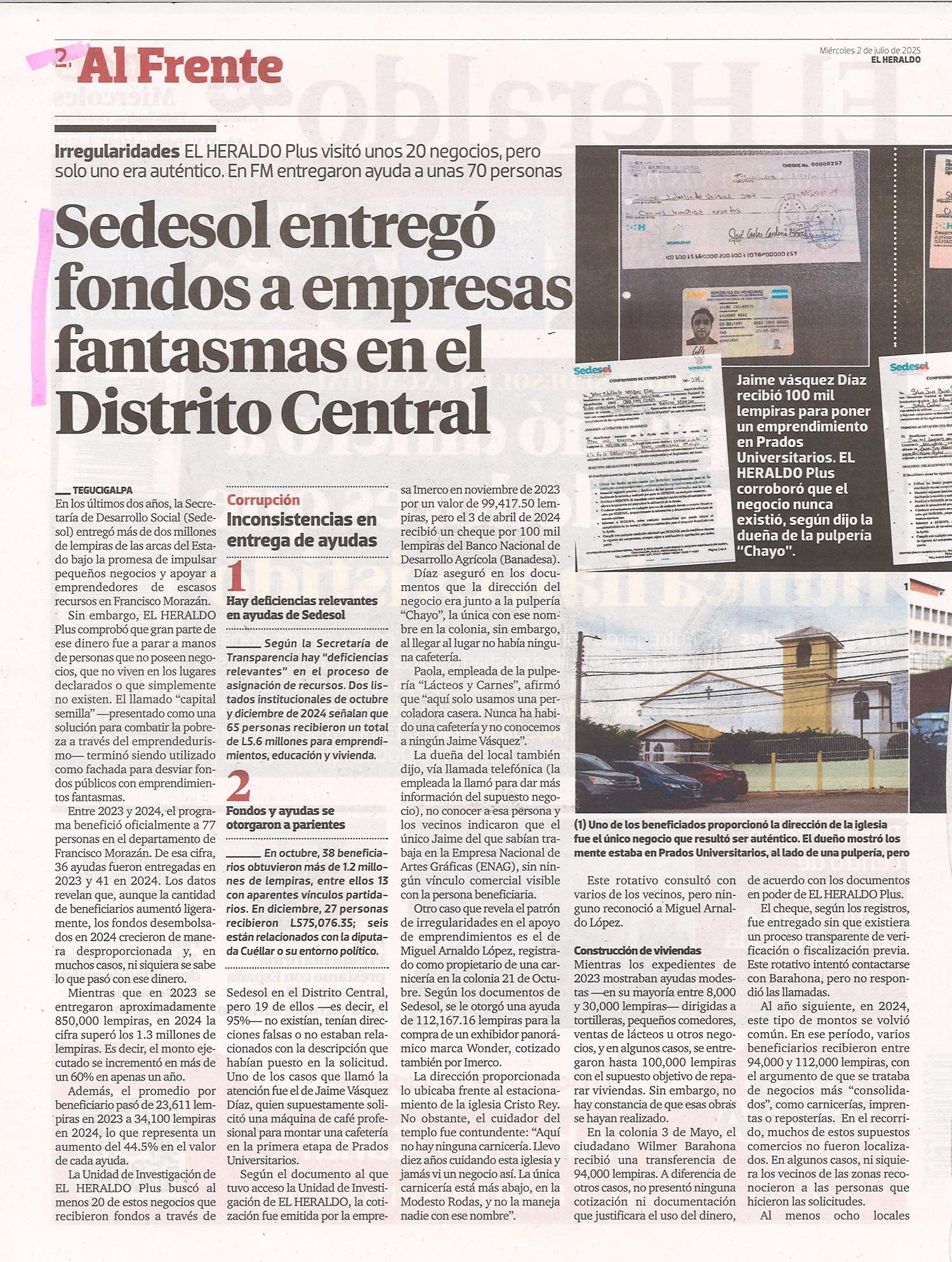 Nacionales Sedesol entregó fondos a empresas fantasmas en el Distrito Central. Meredith Andino Diario: El Heraldo Fecha: 2 de julio de 2025 Páginas: 2-3
